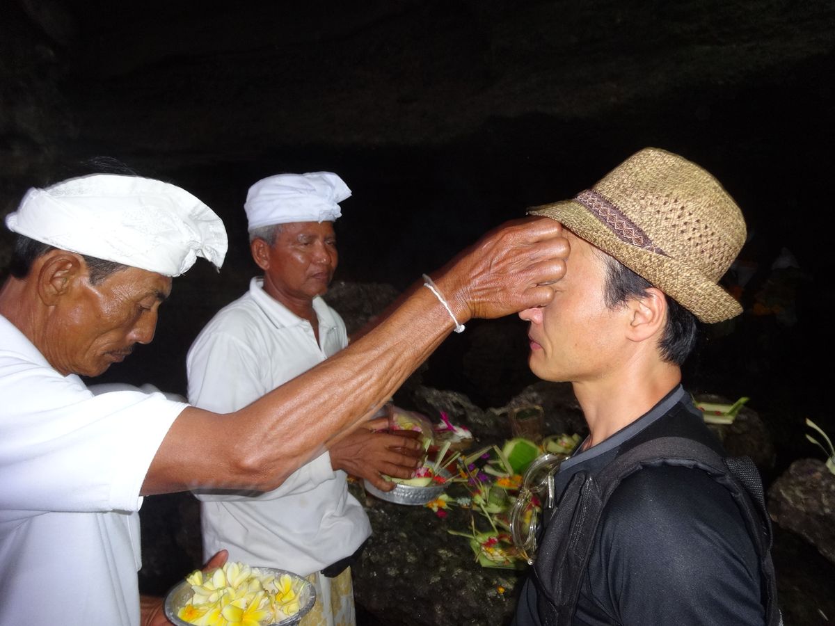 岩の上の寺院には登ることができませんでしたが、その下にある聖水の湧き出る所でお坊さんに聖水をかけてもらい、額にお米を付けてお祈りをしてもらいました。