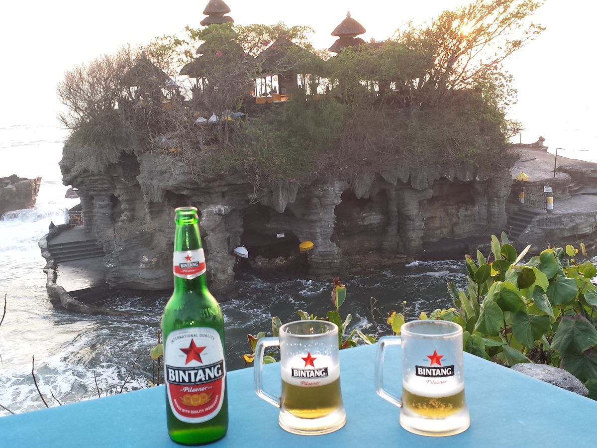 その後歴史のあるタマンアユン寺院、コーヒー(コピ ルアック)販売の店での試飲と充実した内容が続き、メインイベントのタナロット寺院でのビンタンビールを飲みながらの夕景観賞は素晴らしいものでした。
