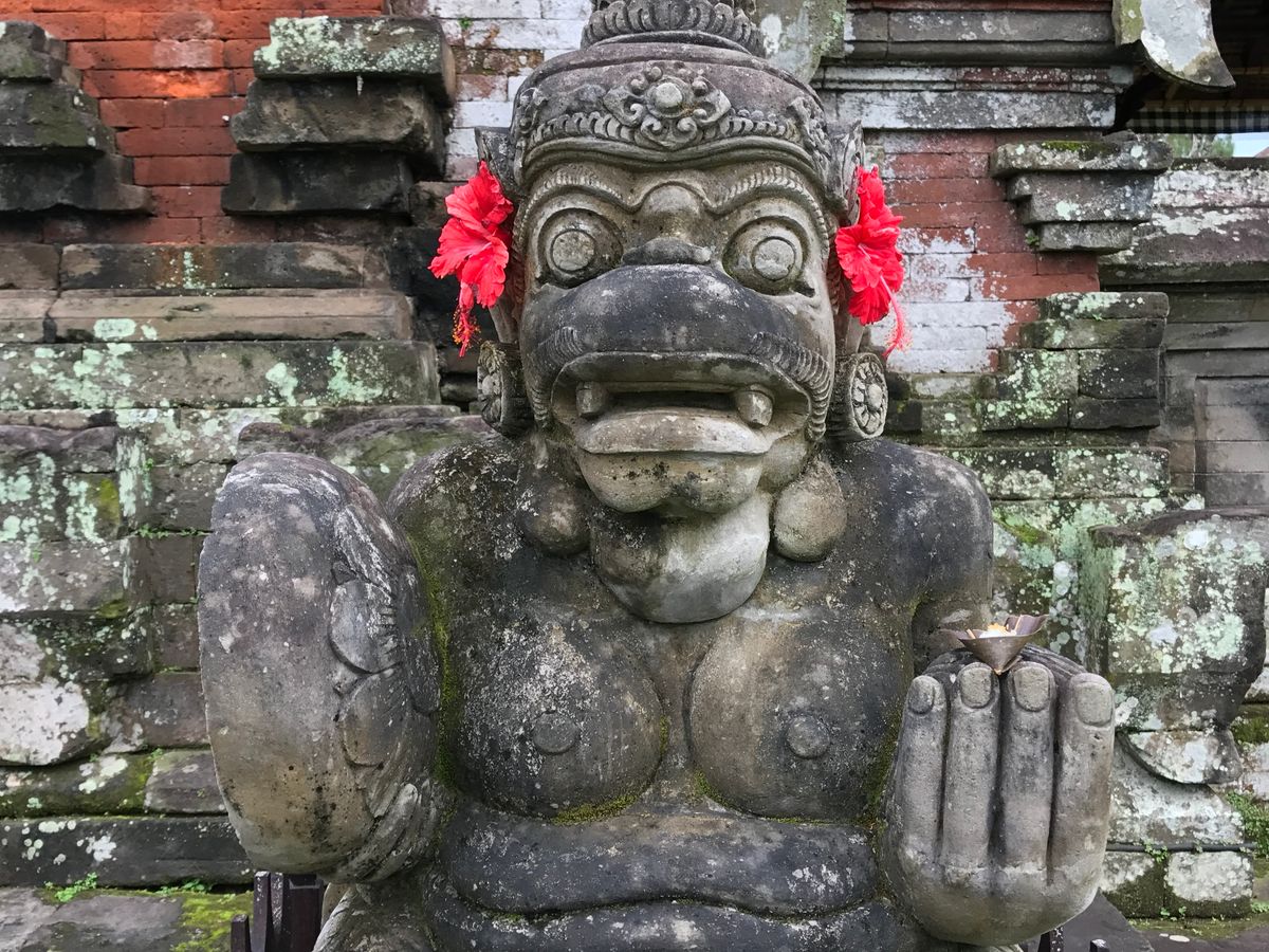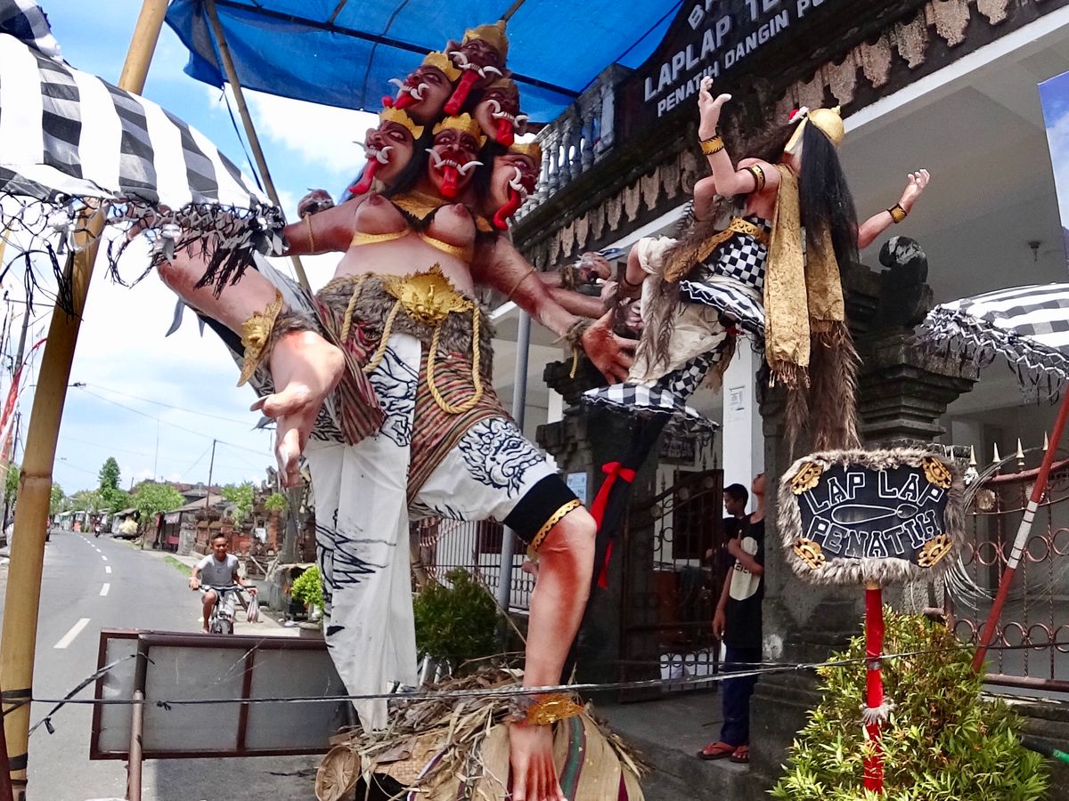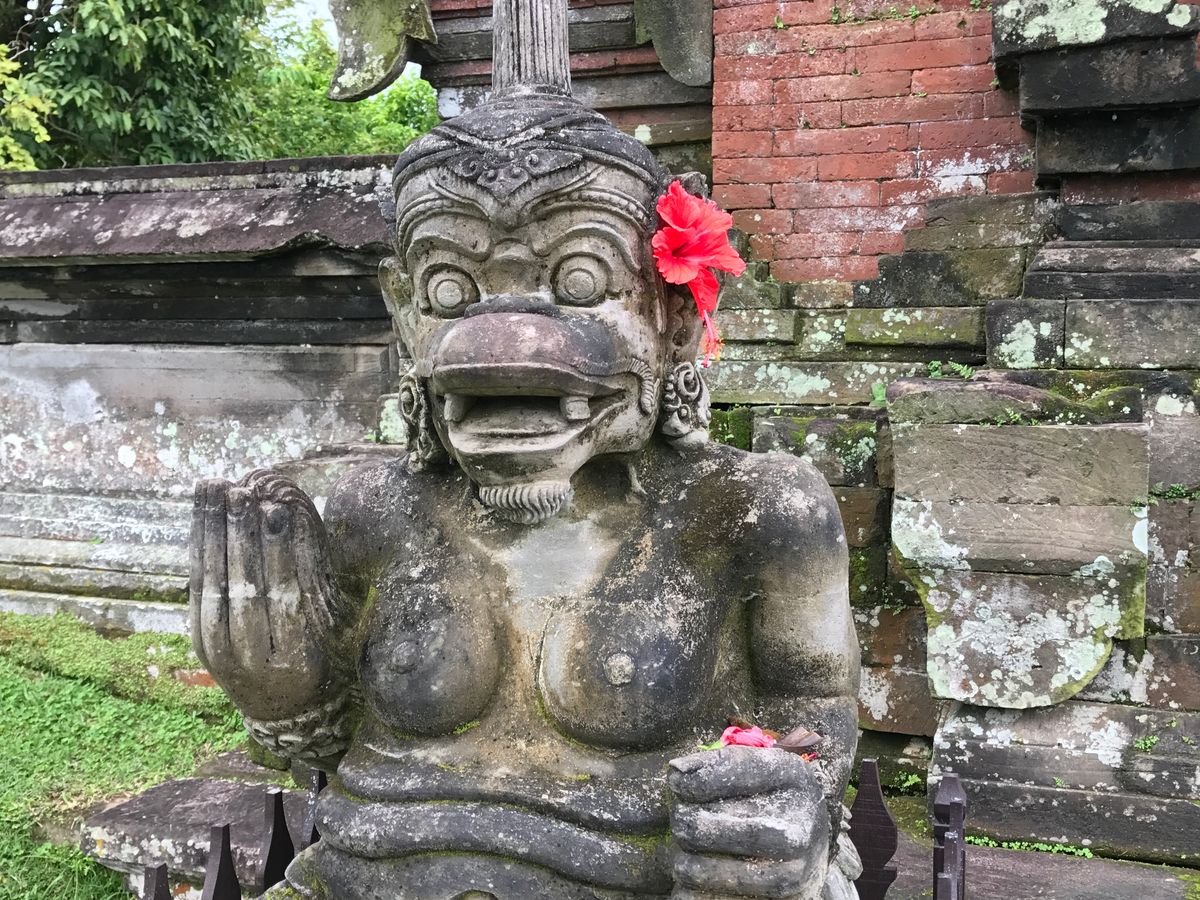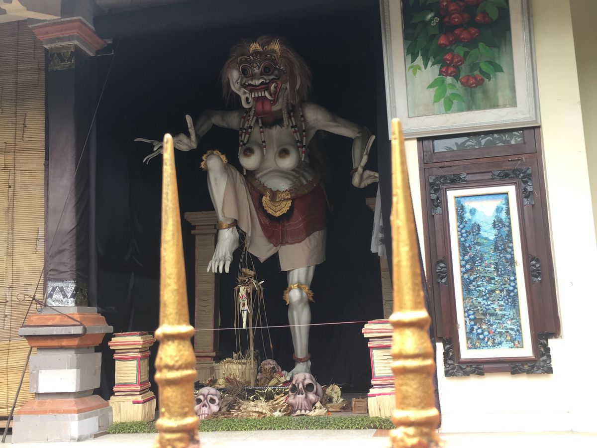 2017年3月28日はバリ暦の新年にあたります。おかげで、年末のバリ島の伝統文化を堪能することができました。午後、タマン・アユン寺院、タナロット寺院に行く途中の村で、大晦日のオゴオゴ祭の準備や、祭で練り歩く際に担ぐおどろおどろしい悪霊の人形が見られる所にも立ち寄っていただきました。