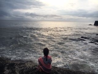 「海岸に降りたい!」といったら、ワヤンさんが先頭を切って案内してくれました。潮の満ち引きが激しいようで、海岸には取り残されたカニや魚がいっぱい!綺麗な夕焼けの下で、海岸のくぼみに残されたカニを探したりして、ワヤンさんと童心に返り楽しみました。