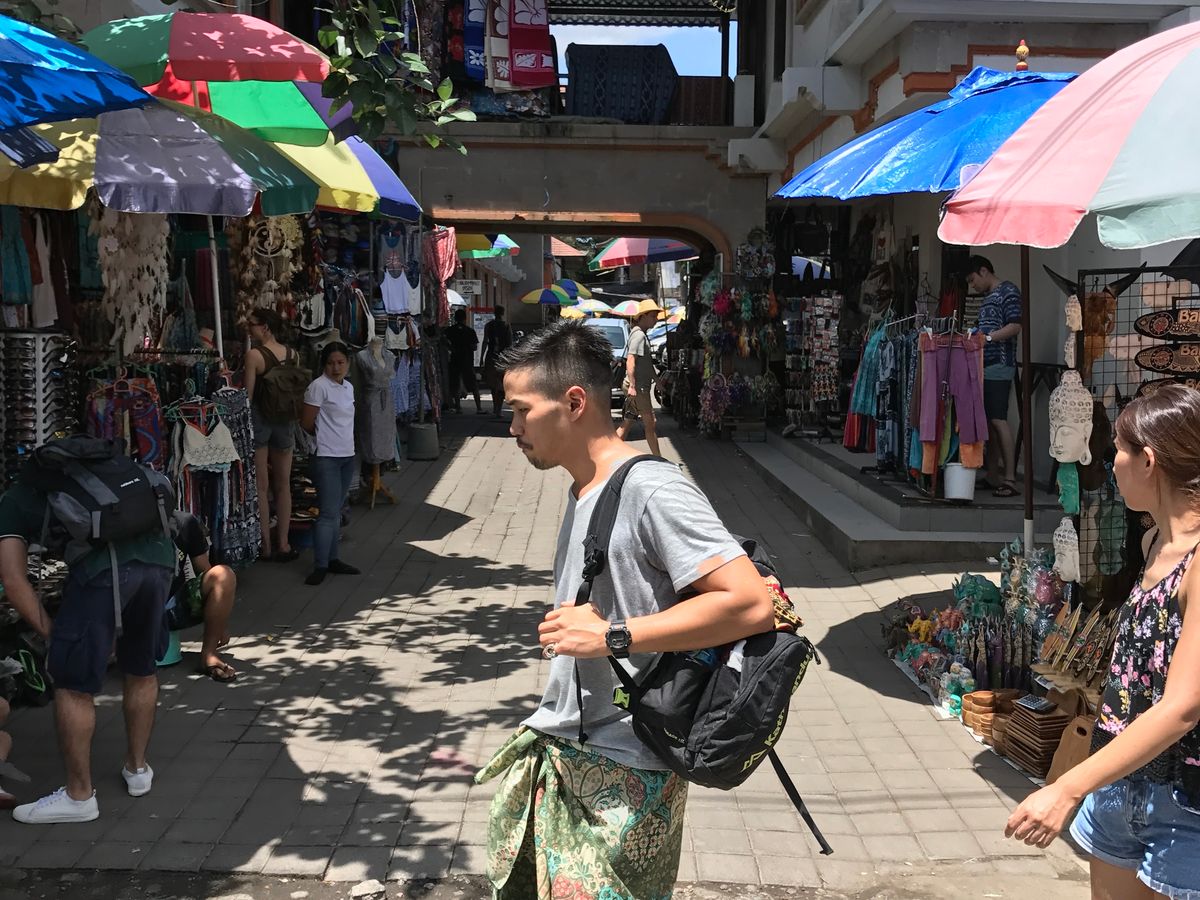 滞在先のスミニャックから向かい、また渋滞もあったのでウブド到着まで1時間半掛かりましたが、ガイドさんは明るく笑顔で接してくれました。 最初にテガラランのライステラスを見ながらカフェでバリコーヒーを飲み、ガイドさんが写真スポットで写真も取ってくれました。 案内にはゴア・ガジャも可能と書いてあったので希望を伝えると時間的に行けないと言われたので諦め、バリ中心部を散策することにしました。中心街は(中心街も?)観光客だらけで渋滞がひどく、モンキーフォレスト前で降ろしてもらって、50分後に近隣のサッカー場で集合することにしました。散策はショップが多い通りを通って端の宮殿に着くまででほぼ時間が経ってしまい、あまり立ち止まってショッピングをする余裕は無かったです。(私達はあまりショッピングには興味がなかったので問題ありませんが)