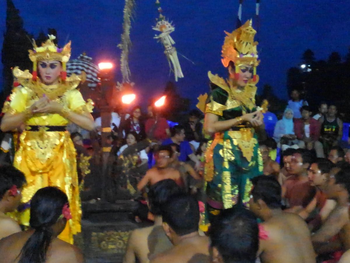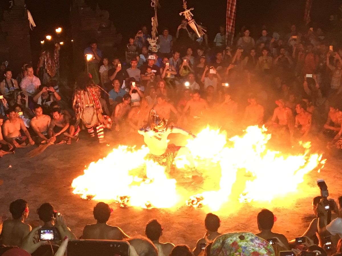 そしてショッピングを終えたら、40分くらい車で移動して、伝統舞踊のケチャックダンスを見ました。開演は18:30から。始まった瞬間にチャッチャッチャと男性の声から始まりました。ストーリー仕立てになっていて、ミュージカルを見ているようでした。他のケチャックダンスの公演と比べると、連れて行ってもらったところは、火を使うので大迫力なんです、とガイドさんがおっしゃっていました。