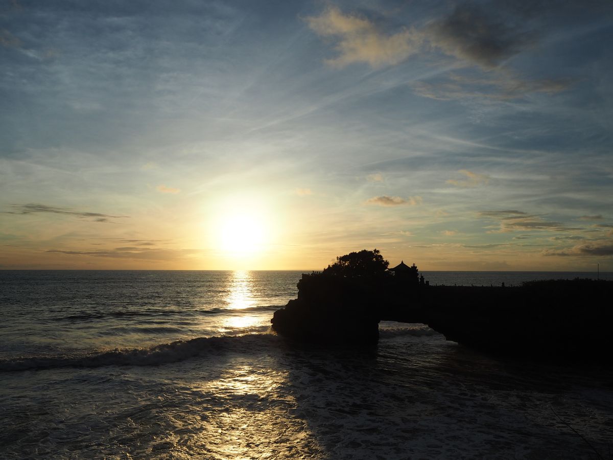 そのあとはウブドにあるプリ・ルキサン美術館へ。貴重なインドネシア美術を鑑賞した後は、ウブドの町の自由散策時間をとってくれました。サレン・アグン宮殿を中心にショッピングしながら散策しました。その後は美しいタマン・アユン寺院を経由、見学し、夕日が美しいと言われるタナ・ロット寺院へ移動しました。当日は曇りがちで、海の水平線の付近に雲があり、ガイド写真のような完璧な夕日風景は見られませんでしたが、夕刻の美しいひとときを過ごしました。このときも到着から夕日まで30分くらい待ちましたが、ガイドのスーヤッサさんは写真を撮ってくれたり、説明をしてくれたりして、傍らでサポートしてくれていました。