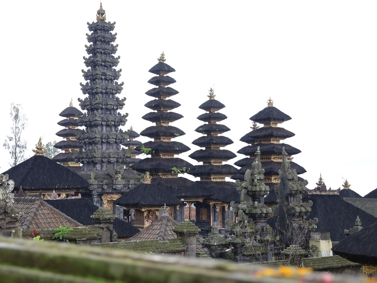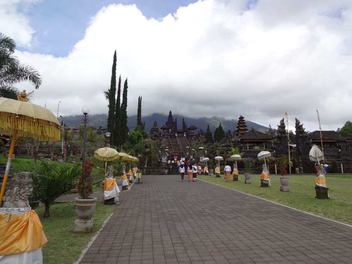 次に車はブサキ寺院に到着。ここは複合寺院でバリ・ヒンドゥーの総本山と言われています。参道も非常に長いので、すぐに拝観できるように、と車で寺院の脇まで上がってくださいました。ここは拝観するに当たって、長いズボンを着ていても布を腰に巻き付け腰布を巻かなければなりません。それが厳かな気分になります。信者以外は寺院内に立ち入ることはできないので、ぐるっと回りながら見学します。9層や11層のメルと呼ばれる塔が何本もそびえていて、荘厳な風景です。