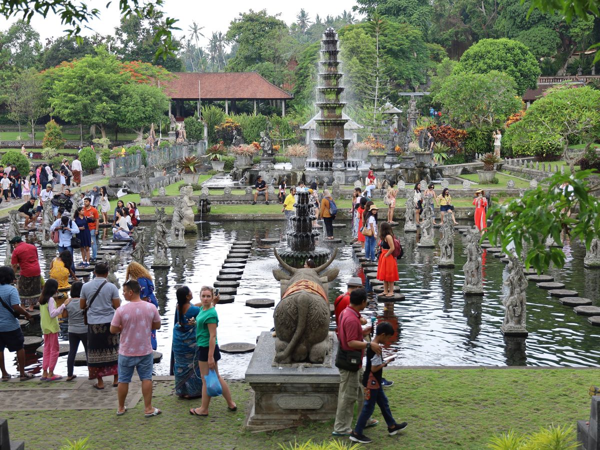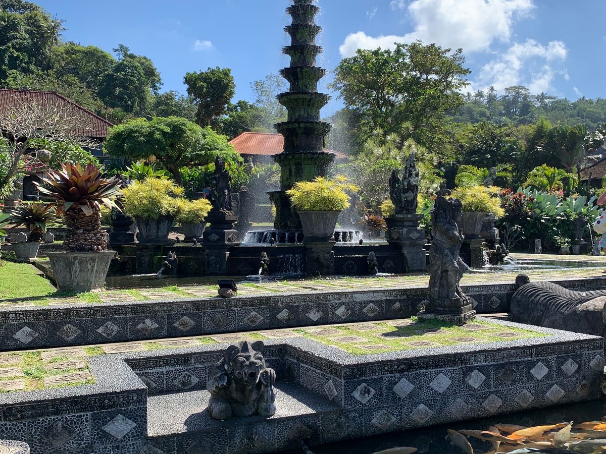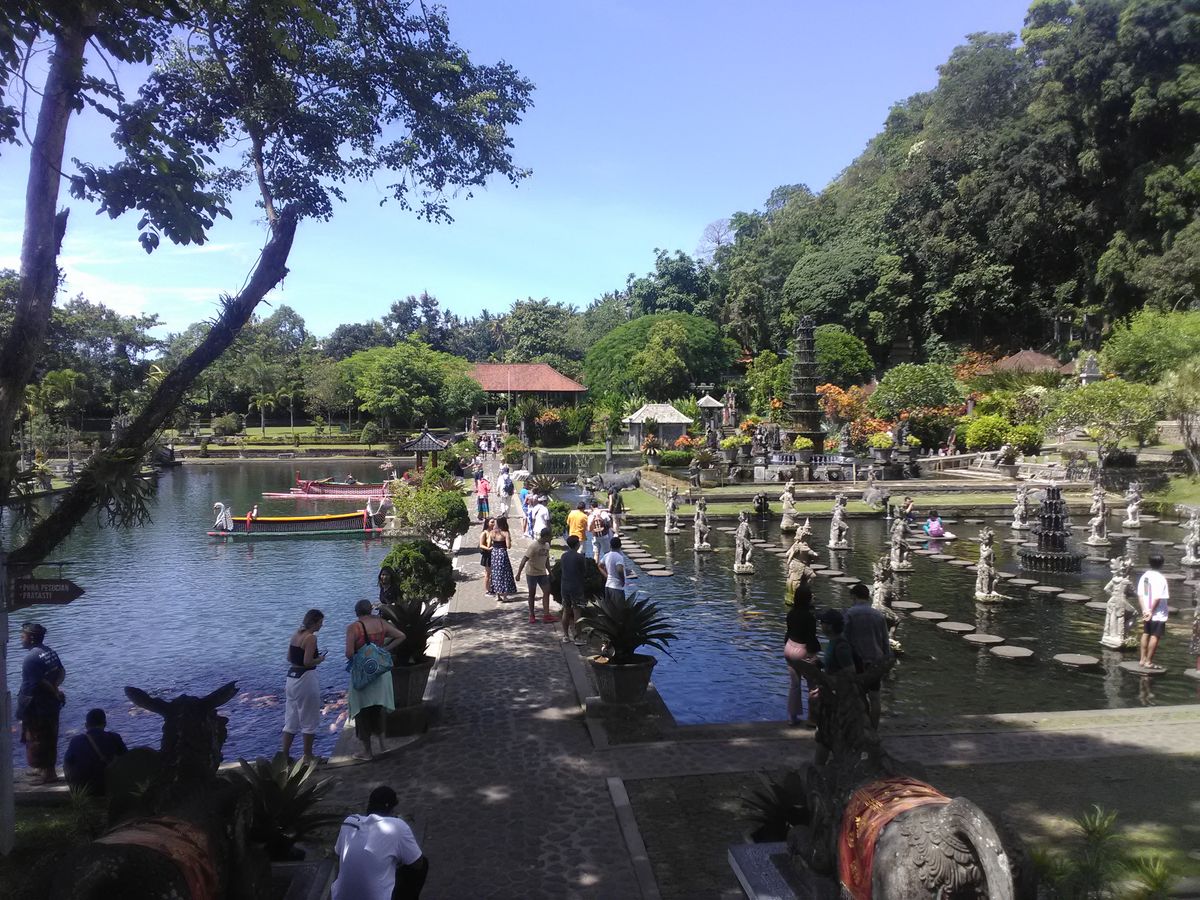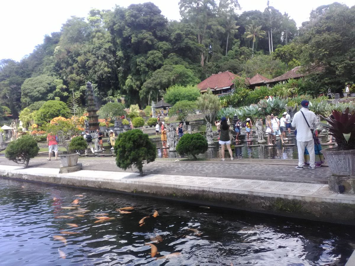 車内で、赤い米や黒い米などは二期作、白米は三期作で栽培される、というような話をしているうちに、水の離宮ティルタ・ガンガ(ガンジスの水)に到着。Renaさんのガイドを聞きながら一週して回る。沐浴場やプール代わりになって子供たちが泳ぎ回っている池など様々な池があります。きれに庭木が手入れされた庭園です。