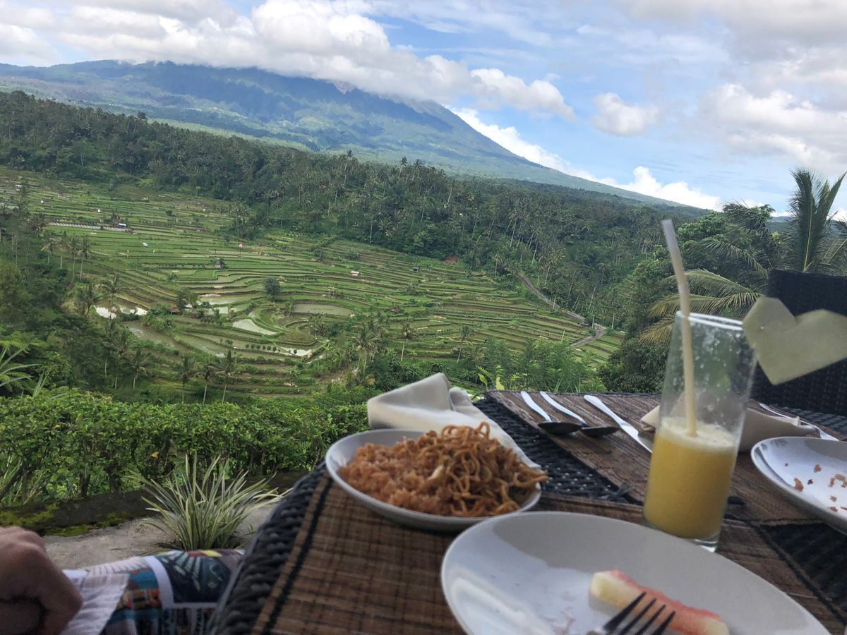 ランチは、ライステラスとアグン山を独り占めできるバイキング式レストランでとりました。