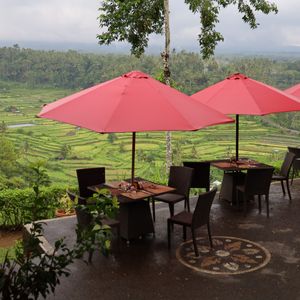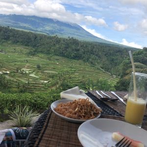 ブキッジャンブルを見てその後お昼へ。私たちは小食で油ものが苦手と伝えましたが、外国人ツアー客のお決まりの昼食会場のようで、特に聞かれること無くLereng Agungというバイキングレストランへ案内されました。景色の良い場所ですが料金は一人11万ルピア。これも後で知りました。料理は、ナシゴレン、ミーゴレン、春巻き、チャンプル、豚串、卵焼き、バナナの天ぷら、フルーツ、コーヒー、紅茶程度。