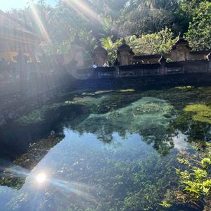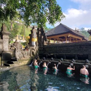 沐浴は汚れてもいい服で参加するようあったので、着替え一式持参しましたが、お寺でサロンが用意されており、下着の上からサロンを着用しました。他にも欧米人の参加者がいて、中に水着を着て参加しているようでした。水は冷たく、なかなかの大きさの魚が泳いでました。朝一だったので、結構な寒さでしたが途中で抜けることも出来ず、順番に水の吹き出し口に頭を突っ込んでいきます。前の人が遅いと水の中で待つ必要があります。ガイドさんは日本からお守りを持ってきて清めてもいいと言ってました。沐浴後は特に、化粧室などはないので、髪の毛は自然乾燥、化粧を直す余裕もありません。ウブドで宿泊したせいもあり、観光地から観光地への移動がかなり時間がかかりました。ケチャダンスは始まる一時間前から、席取りのため座っていましたが、かなり日差しが眩しく、帽子、日傘、サングラス等が必要かと思います。暑いし、待っている間は過酷です。ただお寺には猿が多くいるので。注意が必要です。ガイドさんはいろいろ、心配りしてくれたのですがチップを渡しそびれたのが心残りです。あと、バリに限らないのですが、日本と比べ運転が荒く道も平坦ではないので、酔いやすい方は、酔い止めがあるといいかもしれません。
