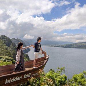 湖の丘にある、ミニブランコや鳥の巣状のフォトスポット