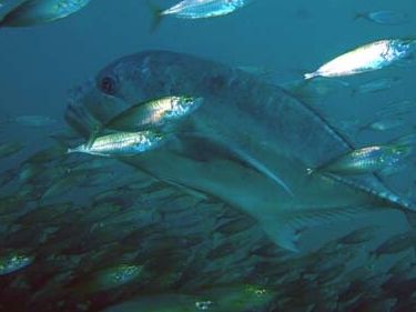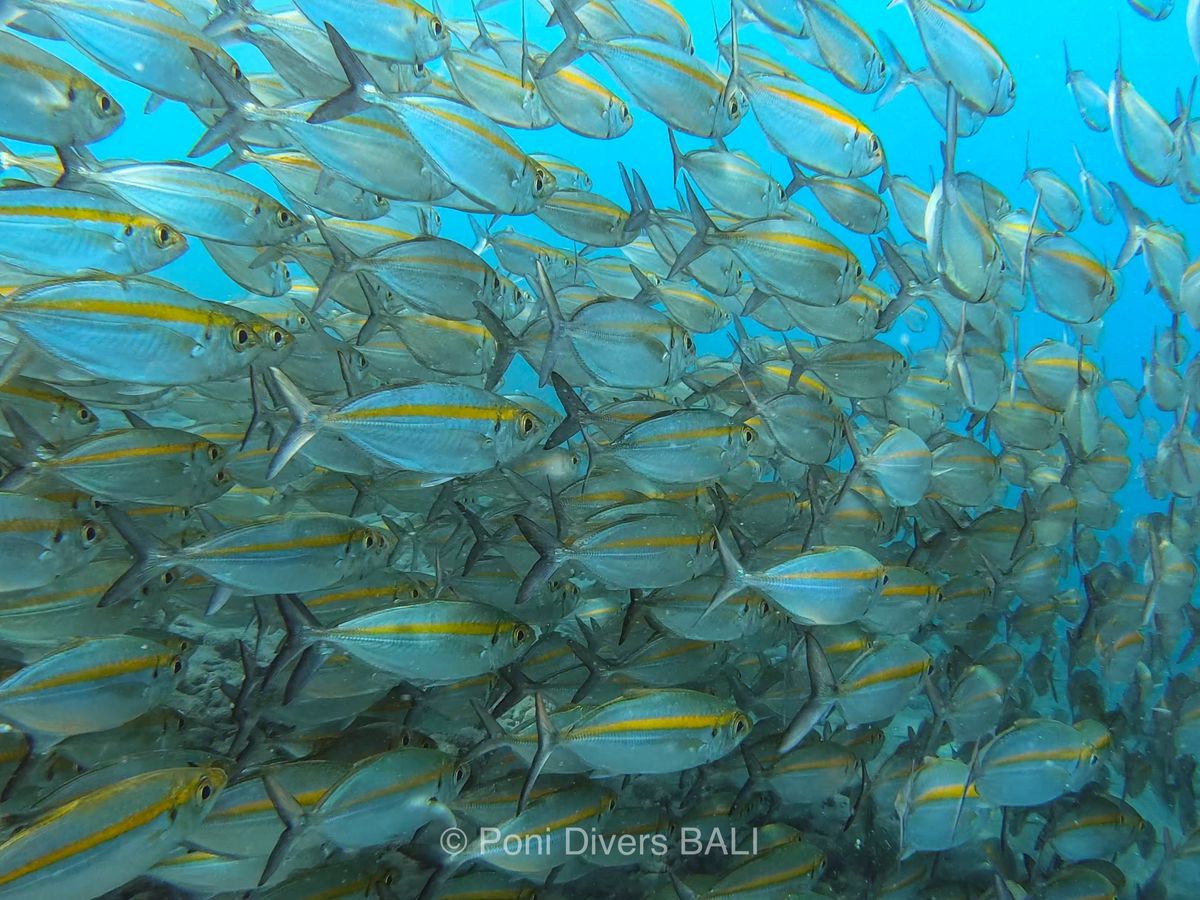 シュノーケリングで上から見ていたアジ玉も、ダイビングでは真横から見ることができます!