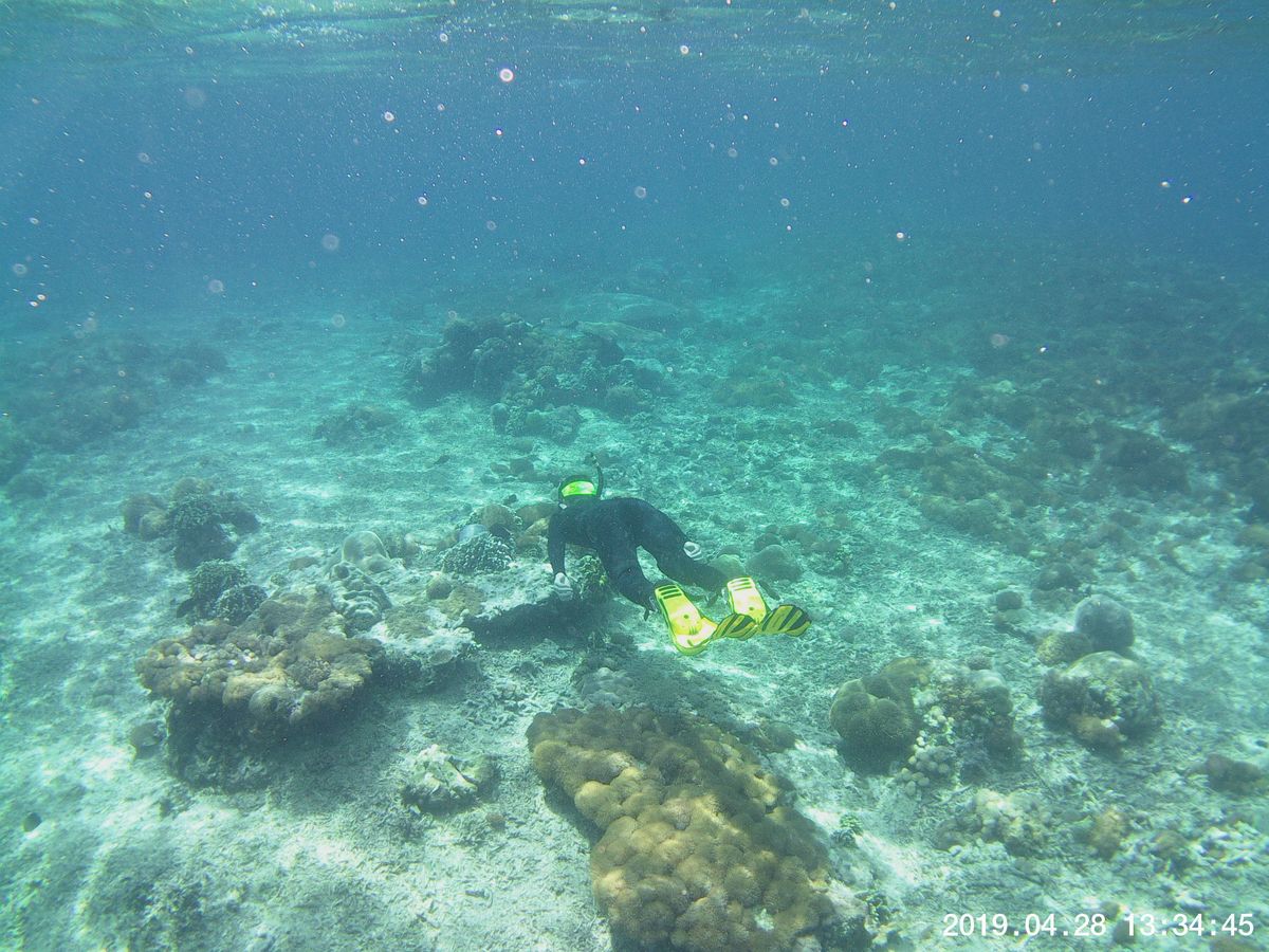 スポットについてからはまず、水に慣れるためにシュノーケリングを30分ほど行いました。その後実際にダイビングを体験させていただきました。今回は初めてのダイビングだったので、インストラクターの方に後ろに付いてもらう形でダイビングを行いました。水中ではテルメアジの群れや熱帯魚、サンゴ礁等を間近で見ることができ、感動的な体験をさせていただきました。