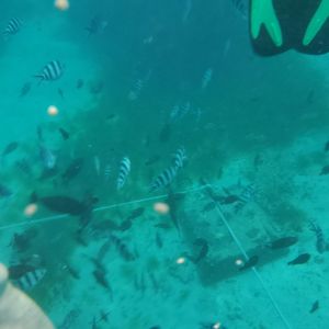 ・お天気はまずまずでしたが、海の中は驚くほどの魚が群れていて、シュノーケリングの時間を忘れるくらい、飽きることはありませんでした。ポイントはわりと浅瀬で、珊瑚であふれていて、チョウチョウウオ、クマノミ、ツノダシなど多様なお魚が鑑賞できます。シーウォークのときに餌をもち、写真撮影してくれます。魚が多すぎて人間が隠れるくらい群れています。