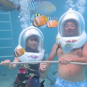 マリンウォークは二人づつ体験できます。魚のエサをもらえるので、たくさん魚が集まってきます。そこで写真も撮ってもらえます。それを後から無料で携帯に転送してもらえました。