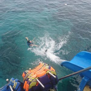 レンボンガン島に着く前に、別の駐留船に乗り換え、そこで、マリンウォーク、シュノーケリング、駐留船からの滑り台で海にダイブする遊びができます。