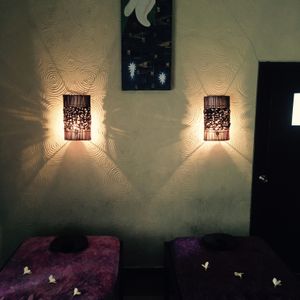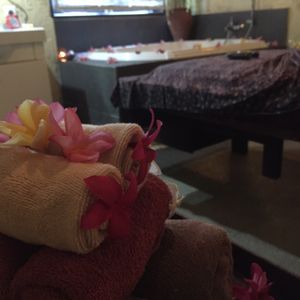 着いたらまずおしぼりと冷たくて美味しいレモンジュースが提供されました。その後、カウンセリングを行い、施術されたくない部位をかいたり、特に行って欲しい部位、アレルギーや化粧品かぶれがないかなどチェックしていきます。それからお部屋に通され、シャワーを浴びると記載していればシャワーの時間を取ってくれます。部屋は薄暗く、静かでフランジパニのお花がたくさん置いてあり、清潔感がありました。ベットも2つ並んでいました。荷物も鍵をかける引き出しに1人ずつしまえます。丁寧に説明してくれます。