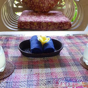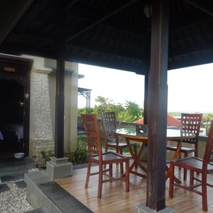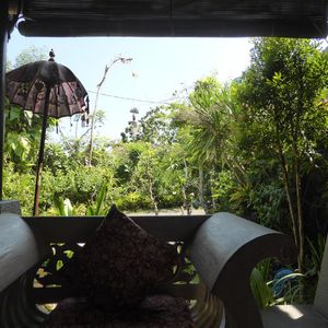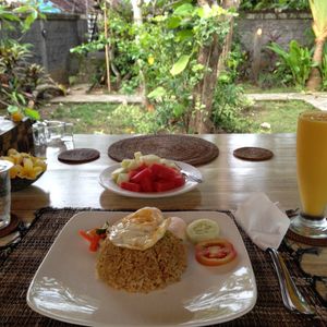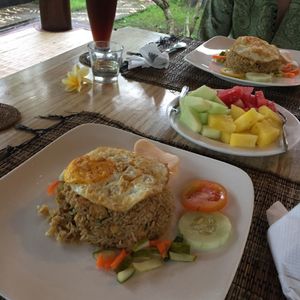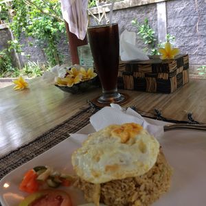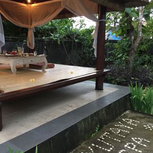 施術後の中庭での食事(確かナシゴレンかミーゴレン選択可)はとてもおいしく、南国の雰囲気満点で素敵でした!ただアリがいるので苦手な方は要注意です笑