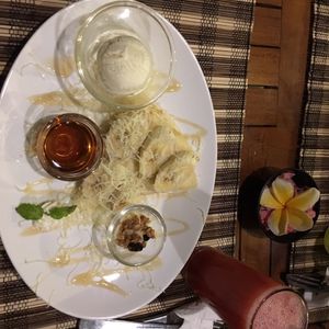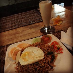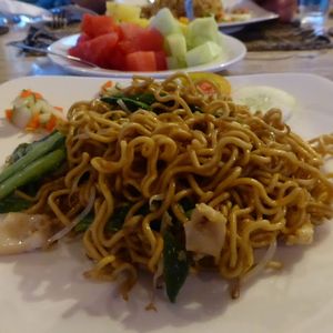 夜ご飯は18時くらいにしてもらいちょうどおなかがすいたタイミングで日の沈む時間にロマンティックなガセボでバナナジュースとシーフードミーゴレンとスイカとメロンのフルーツを食べました。味はどれもおいしかったです。