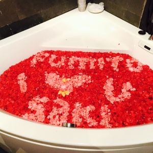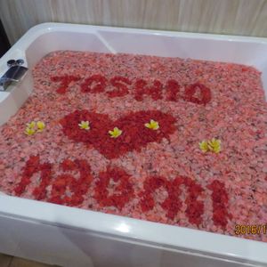 フラワーバス(二人の名前が花びらの色を変えて書いてあります。こんなサービスは初めてでした)、