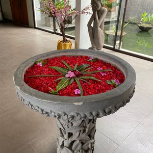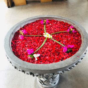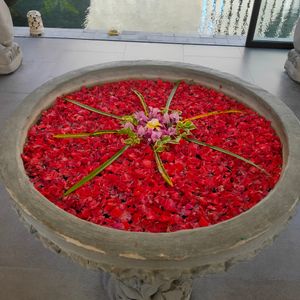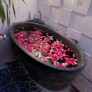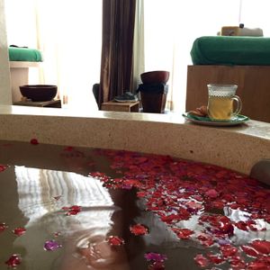 最初のフットマッサージは、マッサージというよりは、足の洗浄かなって感じです。ボディパックのあと部屋の庭に出ると、フラワーバスがありました。お湯はぬるめです。日本人だからそう感じるのかも知れませんね。シャワーのお湯は温かいので、シャワーで身体を温めてました。