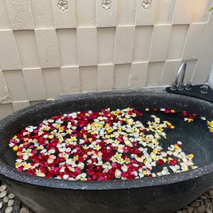 初めてのバリで初スパ体験してきました!体験したメニューは、足マッサージ、全身マッサージ、フラワーバス、クリームバスの4点です。まずは足マッサージ!木の器に入ったあったかいお湯に足を入れてじんわりとやさしいあったかさを感じた頃に足の水気をタオルで拭き取っていただいた後に、クリームを塗ってすべすべしたところで足の裏のマッサージが始まります。足の指をひとつずつ丁寧にほぐしていただき、次はふくらはぎのリンパを流すマッサージを受けた後は足首を回す、痛気持ちいい足裏ゴリゴリなどがつづきます。次は全身マッサージ!好きな香りを4種類から事前に選べたのでローズを選択しました。ベッドの上にうつぶせになりタオルをかけた上からまずは全身マッサージが始まります。次にローズのオイルで全身をしっかりマッサージしていただき心も体も完全に癒されます。その後にフラワーバスに入りリッチな気分でステキな香りのお風呂体験をしました。最後にクリームバス!これも香りを事前に選べます。アボカドの香りをチョイスし、ヘッドマッサージの後にクリームバスを受けたあとは軽く背中のマッサージを受けました。とてもラグジュアリーな時間を過ごすことができました!おススメです。