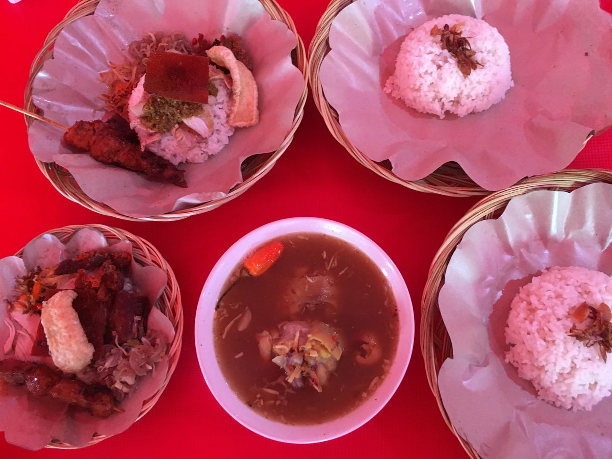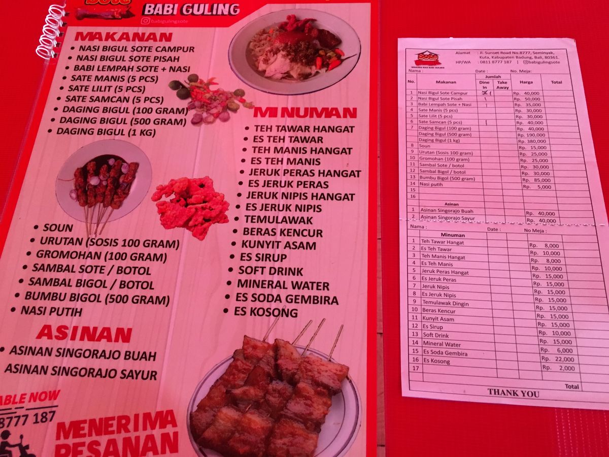 ランチは予め調べておいたワルンに連れて行ってもらいましたが、何故かこの日は営業しておらず、ガイドさんおススメのバビ・グリン(豚の丸焼き)のワルンに連れて行ったもらいました。スミニャックで有名なお店なのでそれなりに観光客もいましたが、多くは地元の人。様々な豚の丸焼きの部位が入ったバビ・グリンは絶品!子どもたちには少し辛いようでしたが、大満足です。