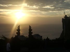 当日は滞在していたクロボカンのホテルに午後三時にきてもらいました。最終日の為、チェックアウトを済ませてすべての荷物(ロングサーフボードを持参したので、それを収納できる大き目のバンを特別に手配して貰いました)を積み、ウルワツ寺院を目指しました。途中我儘を聞いてもらい、バリ陶磁器で有名なジェンガラ工房に立ち寄ってもらい、皿やおちょこ(?)を買いました。フォーシーズン等有名なホテルっで採用されているだけあり、その色使いには感銘しました。その後土産物屋によった後にウルワツ寺院に到着。ケッチャダンスの会場までは暫く歩きますが、途中サルがいっぱいいるのには驚きました(食べ物を狙ってくるらしく、途中リックを狙われた外国人がいました)。その後夕暮れにかけてケチャを見学、ガイドさんが真ん中の前から三番目の席をとってくれたおかげで踊手の表情までよく見ることができました。その後、ジンバランビーチのシーフード屋台にいき、その場でイカ、タイ、エビを選びバーベキュー(インドネシア風ソースで焼いておりおいしかったです)をビーチに置いたテーブルでワインと一緒にいただきました。すぐそばが空港で飛び立つ飛行機が見える程でした。最後にローズスパでバリマッサージでしたが、出発の時間まで余裕がないため、90分コースを45分に短縮せざるえなかったのが少々残念でしたが、本当によい思い出になりました。