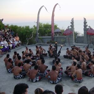 今回、初めてのバリ旅行でした。5年生の長男が、学校の授業でケチャクの事を習ったばかりだったので、迷わずこのツアーに参加しました。ピックアップも時間通りで、「どこか、行きたいところがあれば。」という事で、地元のスーパーに寄ってもらいました。ウルワトゥ寺院からのインド洋の眺めは、すばらしく、とても綺麗な所でした。ただ、猿が少し凶暴で、3年生の次男は怖がっていました。実際、記念写真を撮っていた白人男性は、背後からメガネをすばやく取られていました。後で取り返してもらえましたが・・ケチャックが始まる前に日本語の説明文をもらえるので、読んでおくと話の流れがわかります。「火を使うので前の席は危険です。」とガイドさんに言われたので、最上段で観覧しました。始まるまで30分位あったので(早く来すぎ?)と思っていたら、アッというまに満席になりました。又、その日は風が強く火の勢いが激しくて、前の人からは悲鳴が聞こえていました。ダンスは男性の「ケチャ、ケチャ」という独特のリズムと迫力のある演舞に見入りました。後の食事も波打ち際のビーチで、シーフードを満喫し、これぞ、ザ・バリ!という半日をとても楽しめました。