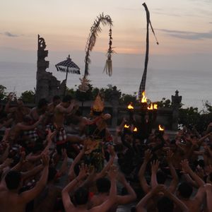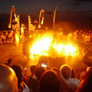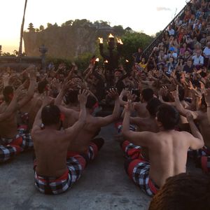 ウルワツ寺院を見学したあと、ケチャダンスの会場で綺麗な夕日をみながらケチャダンスが始まるのを待ちました。そして日没とともに「ケチャケチャ」といいながら大人数の男性が入ってきてお祈りをしながら清めの水をかけられたあと物語が始まります。幻想的な雰囲気の中物語が進み、ときおり英語や日本語で挨拶をしたり、おもしろいことを言ったりして会場を盛り上げてくれました。猿の役に扮した方が観客席に入ってきていたずらをしにくるのもおもしろかったです。終盤のファイヤーダンスも迫力があるのでぜひ見に行ってください。