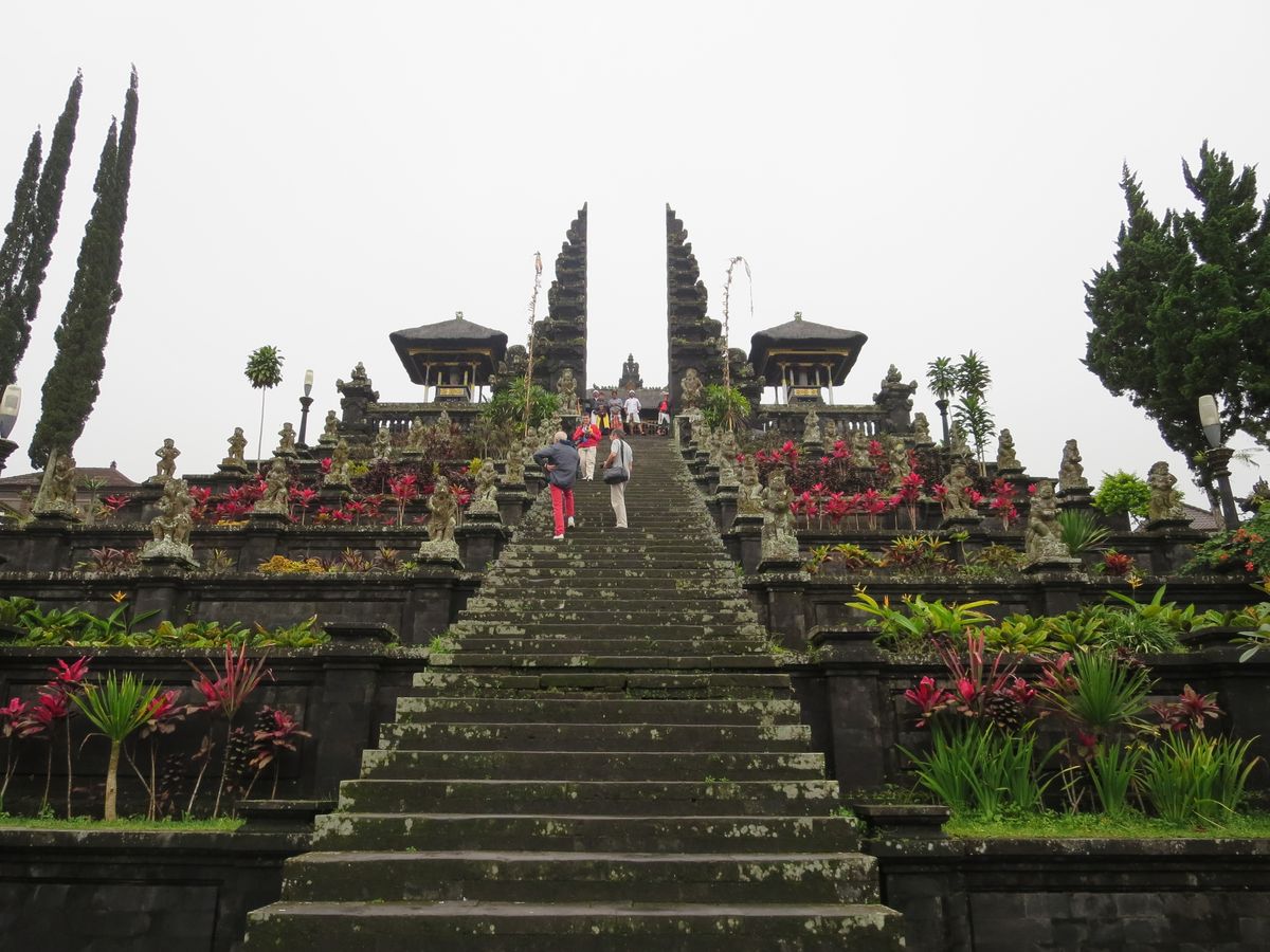 寺院はお祭りなので、装飾がされていて人もいっぱいいました。晴れていれば寺院奥にアグン山が見えるそうですが曇っていて見えませんでした。