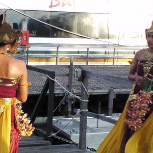 受付も日本語で出航までウェルカムドリンクを飲みながらまず船をバックにポーズ・・ バリの衣装のかわいい女性が香りのよいレイでお出迎え。まえに並んだ男性が言葉を交わしてくれ