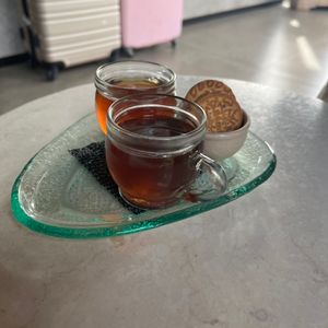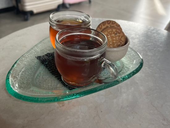 フロントでジンジャーティーとクッキーをいただき、送迎バスで10分足らずで空港へ。
