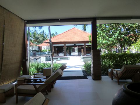 綺麗なホテルの中庭やプールを抜けると、ひっそりとスパが建っています。中は落ち着いた雰囲気でリラックスできる暗さ、廊下・トイレに至るまでとても綺麗な建物でした。