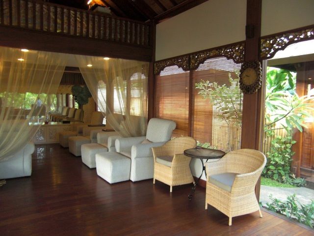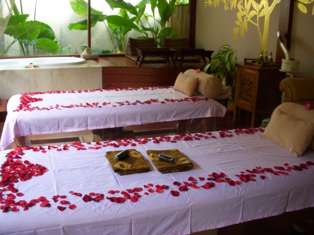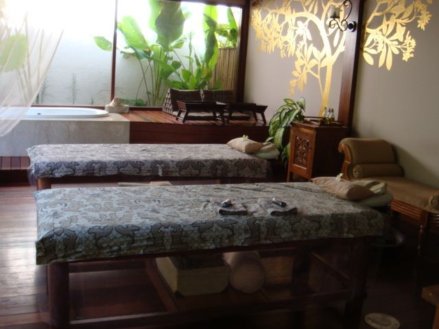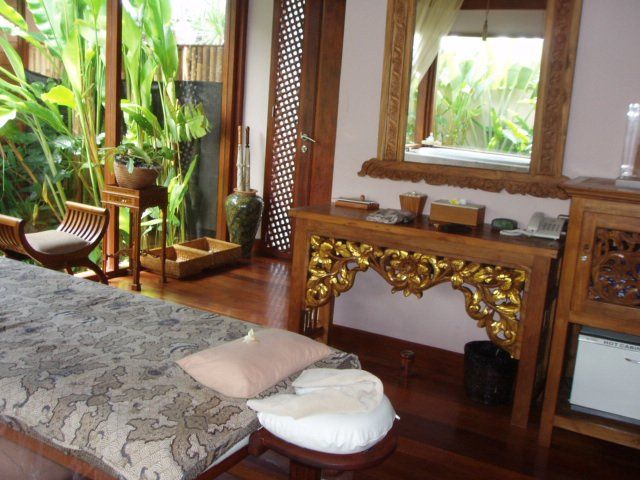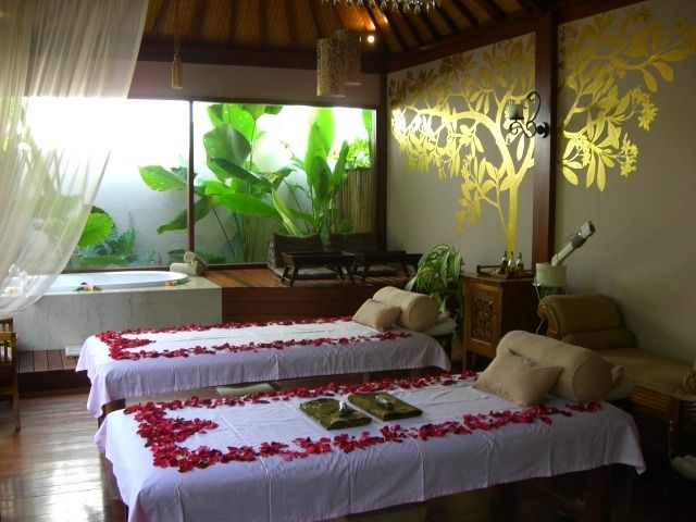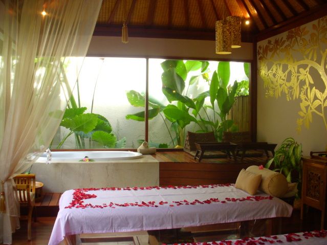 まず、送迎の方がカンジの良い方でした。場所は私達の一番のお気に入りレストラン・ウルティモのすぐ裏手でした。到着後、ヴィラ・フロントのバリニーズ女性が素敵!!チャンティックで日本語がお上手で上品で・・・カートでスパ施設に移動になりますが・・・細い小道を、ゲストは後ろ向き!で柵が無く、かなりなスピードで進むので、タイのトゥクトゥクより迫力のある乗り物に認定!(笑)美味しいウェルカム・ジャムー・ドリンクをいただいた後、これまたロングヘアーの素敵で気さくなカンジの日本女性のスパ・ゲストリレーションの方に案内されて、壁に金色の樹木の絵を施した素敵空間のカップルルームに移動して施術開始です。本当に素敵で、ここに住みたい・・・!!とふたりの意見が一致。音楽もバリらしい音楽で寛げます。が、途中からハーバルバス用のお湯を溜める音が勢い良く大音量でドボドボと!!せっかくの音楽もかき消されてしまい残念!蛇口からバスタブの底まで布を垂らしてお湯の音を抑える等の改善が必要なのでは?・・・目をつぶっていると音は重要なファクターですから・・・