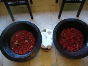 アラン1ちゃんで$7.77というキャンペーンを発見したので、すぐに2名で申し込みました。このようなスパは初めてで少し緊張していたのですが、現地には日本人スタッフの方がいらっしゃって、いろいろとお話をしていただけたので、内容を理解したうえでリラックスしてマッサージを受けることができました。また、ホテルまで車でお迎えに来てくれたのですが、レートがいいところで両替したいという希望を伝えたら、わざわざ少し遠いレートがとても良かった両替所まで連れて行ってくれたり、スパ以外でも充実したサービスでした。僕は彼女と2人で参加したのですが、基本的に2人1組での行動で、カップルでの参加にも非常にお勧めのスパです。ちなみに写真はクリームバスの種類です。それぞれの髪の状態によっておすすめのクリームがあるらしいく、日本人スタッフの方がおすすめを教えてくれます。ちなみに僕は黒髪により美しい輝きをあたえてくれるというクミリにしました(笑)