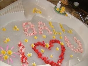 妻はなにより,フラワーバスに浮いている花で文字が作ってあることに感動してました。ホットストーンを背中に当てている間,スタッフがこそこそ何をしているのかと思ったら,これを作ってたんですね。う~ん,納得。
