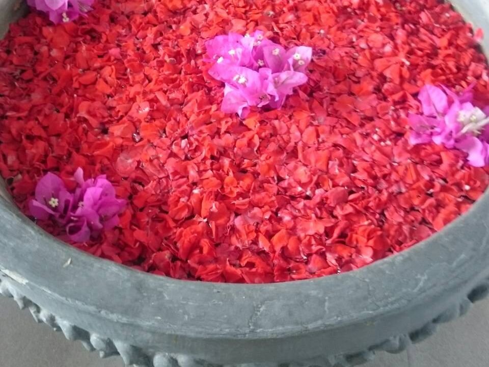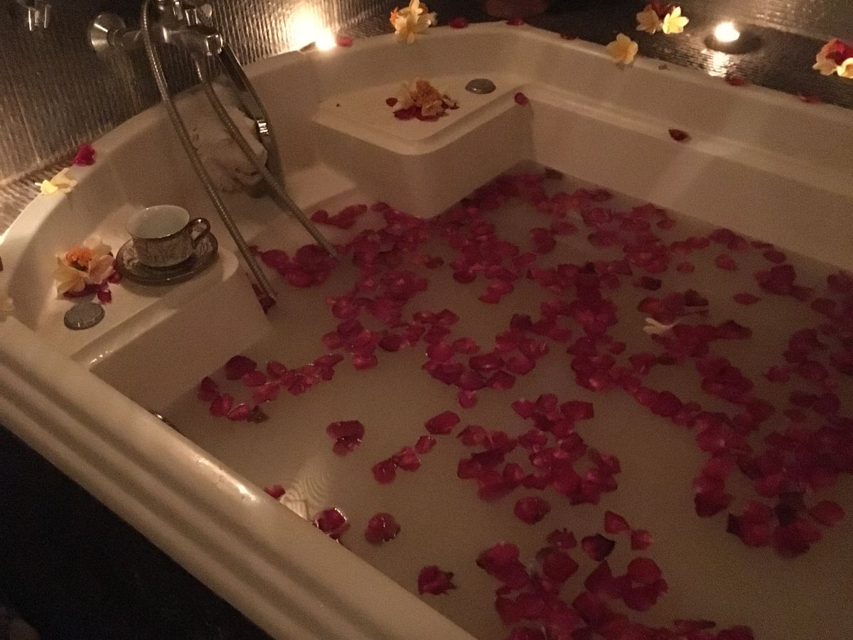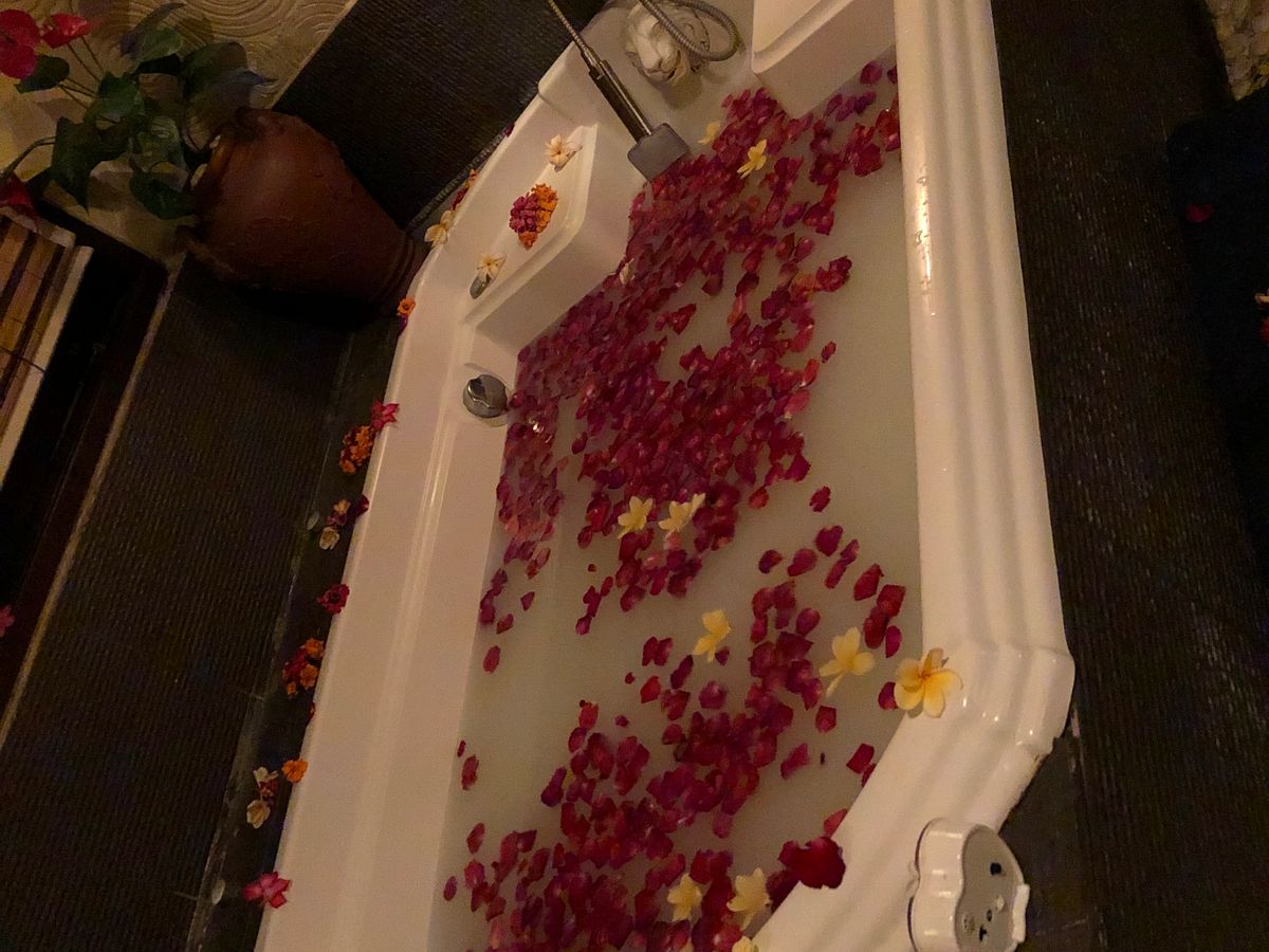 ハチミツを塗って、スクラブを落としてからのフラワーバスは、南国感気分を味わえました!! クッキーとスイカジュースを出してくれて、優雅な気分に浸れます。