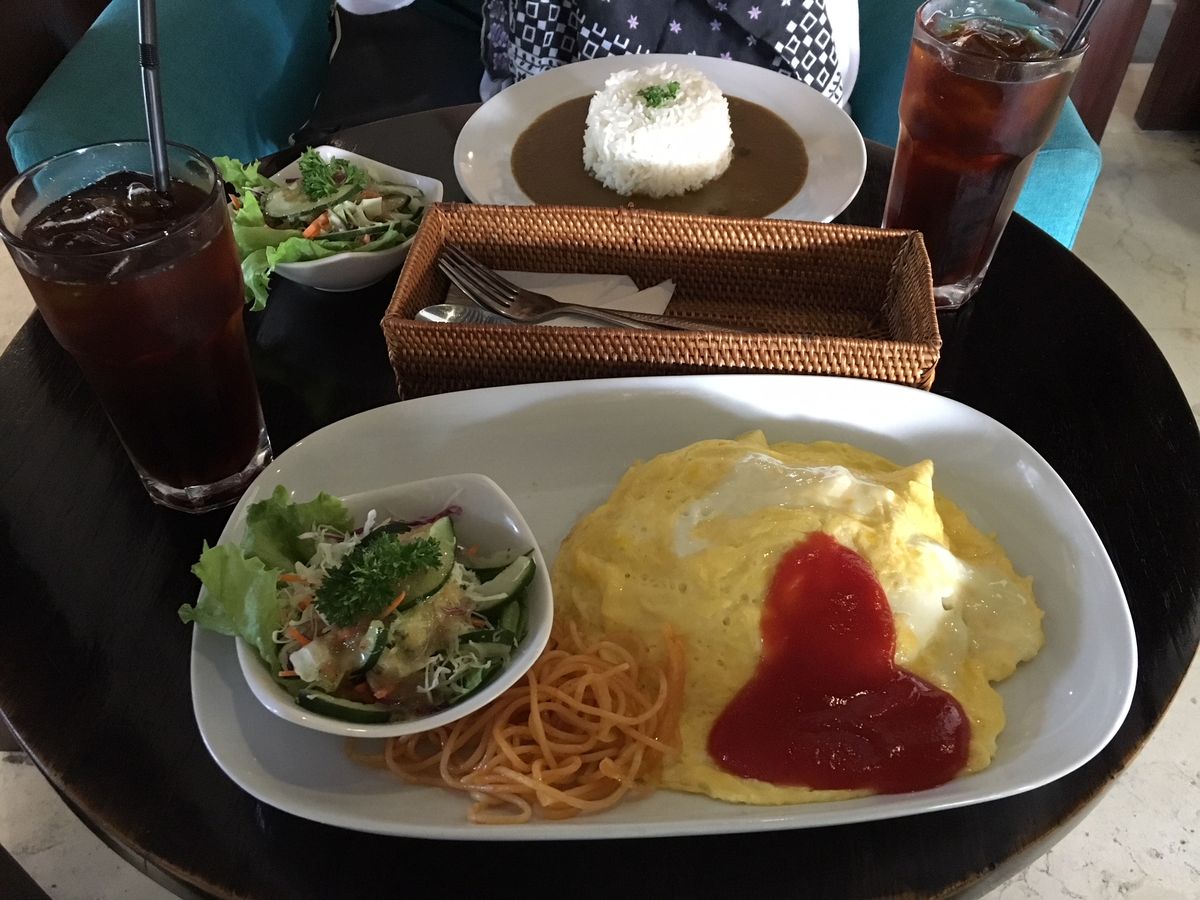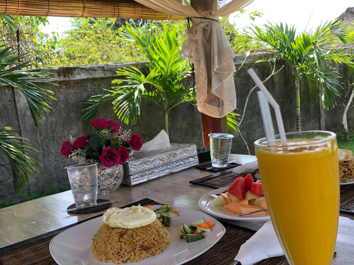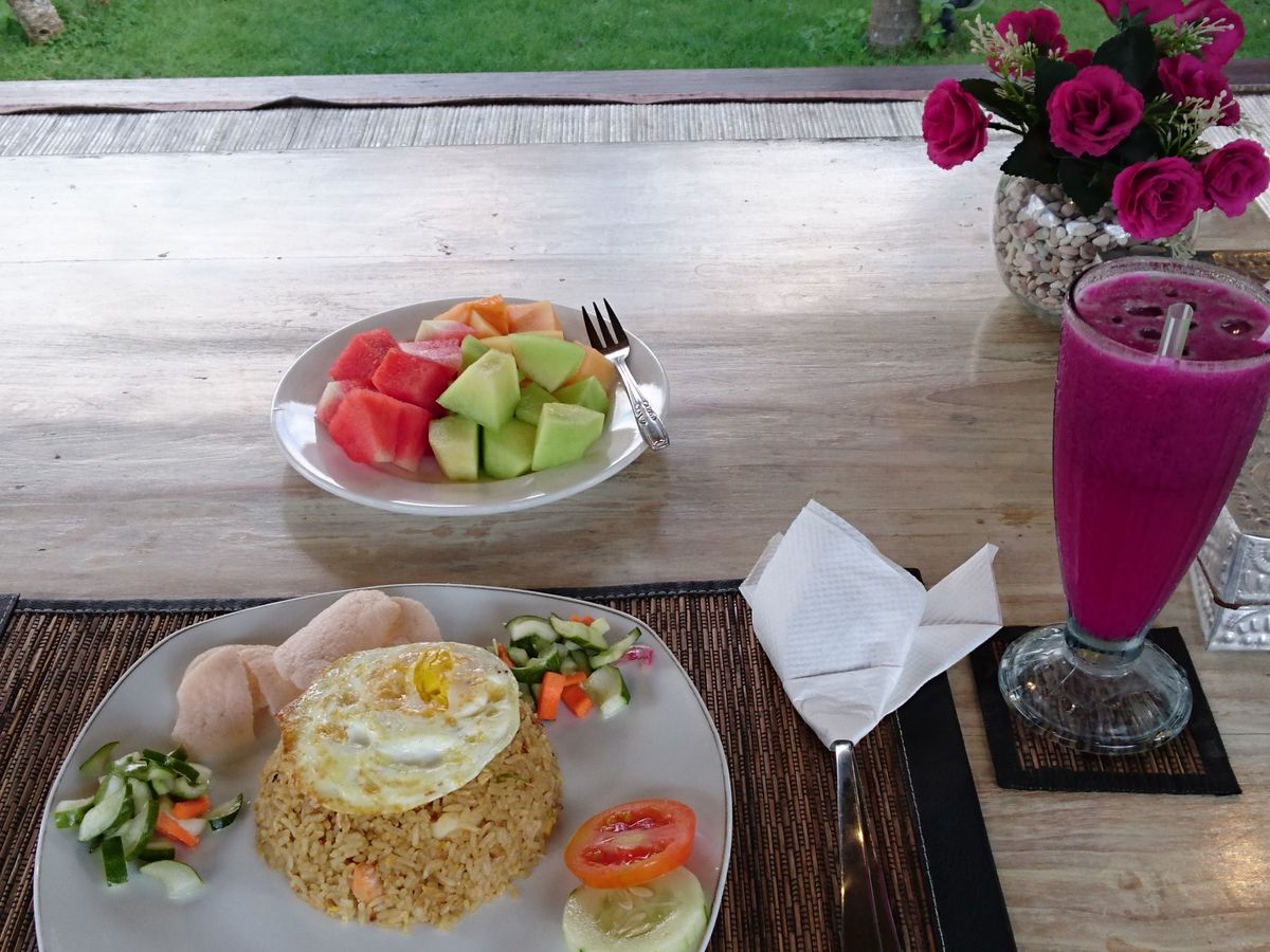 食事つきだったので、ナシゴレン、ドラゴンフルーツジュース、盛りだくさんの果物もおいしくいただきました。