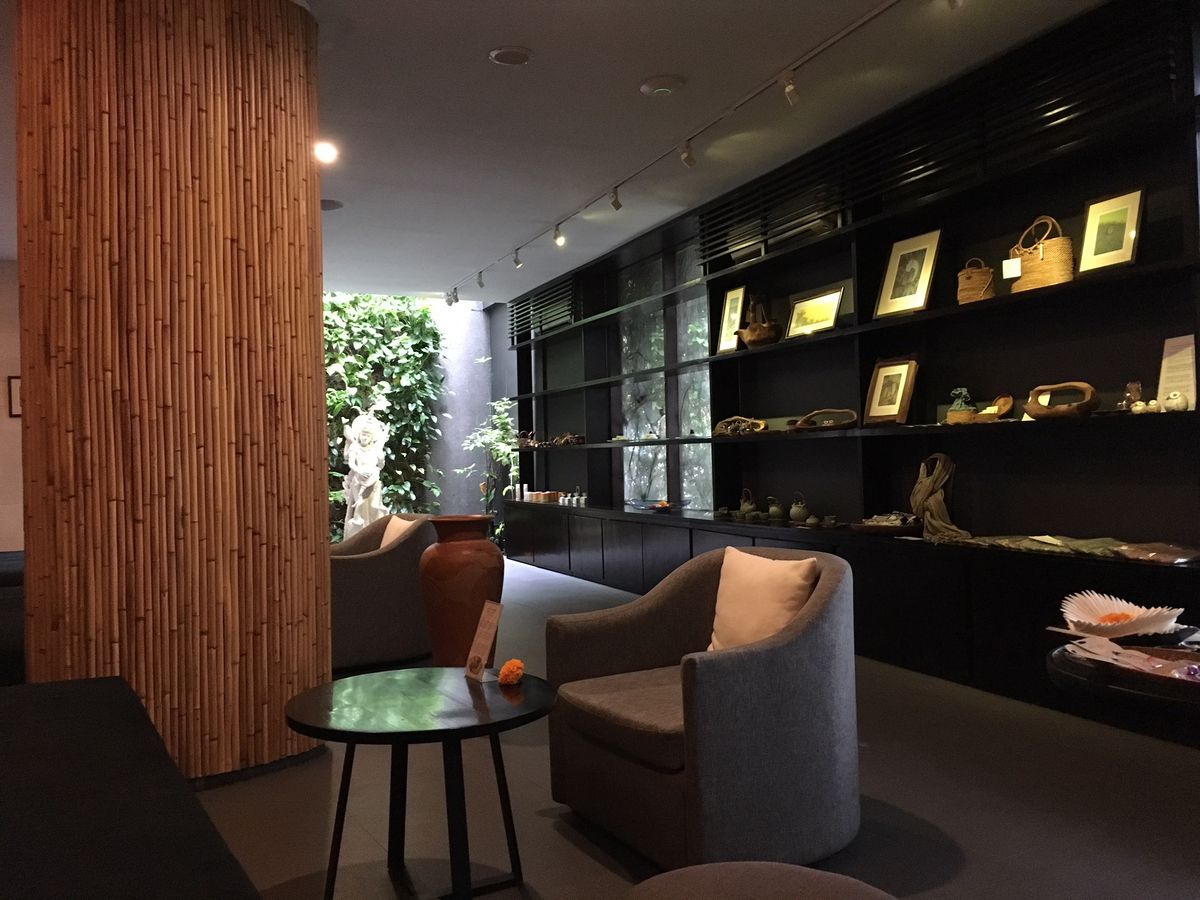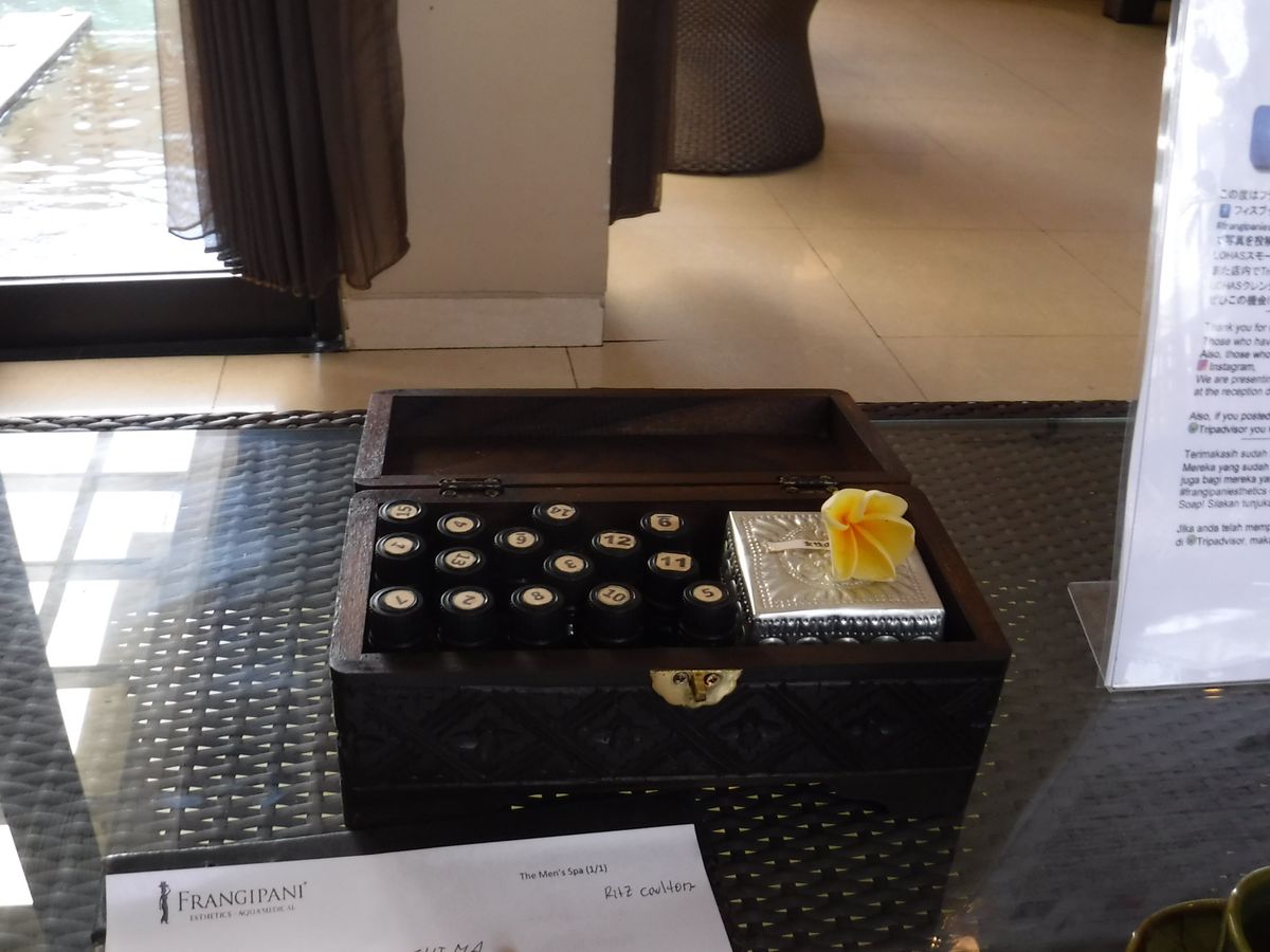 スミニャック地区のホテルに迎えを頼み、1時間かからずに到着。到着すると最初に生姜の温かいドリンクを飲みながら、マッサージに使うオイルの香りを選び、食事メニューを決めます。