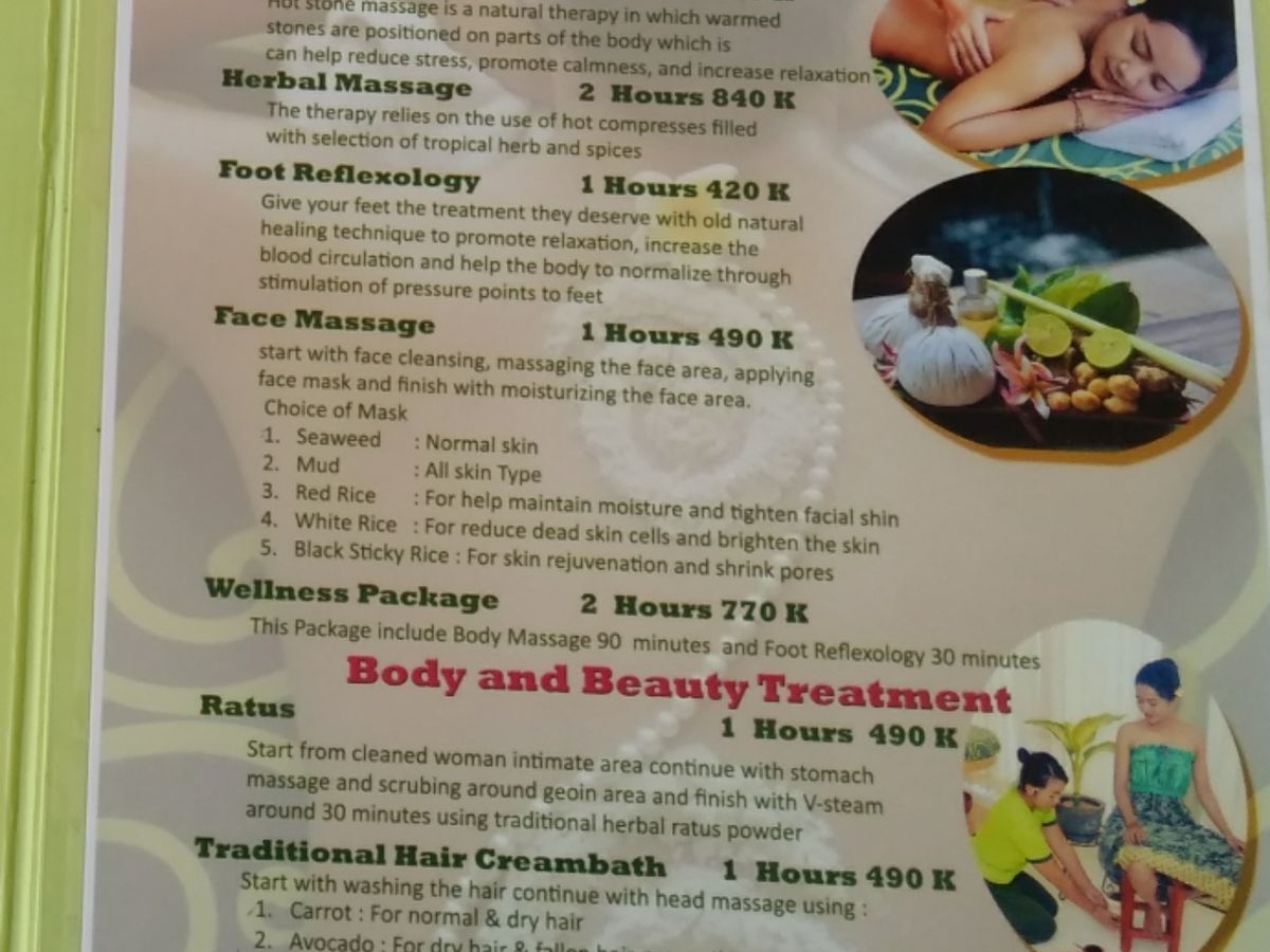 帰国前、さっぱりしたいと思い予約!16:30開始のプランで、16時ホテルにお迎え予定でしたが予定よりも早く送迎さん待ってくださってました!カップルプランを申し込みましたが3時間半きっちりしていただき、満たされました!帰りはクタまで大渋滞。時間に余裕を持って予約おすすめと何人かの口コミに記載してあり、その通りだと思います。スパは総じてすごく良かったですが、ヘッドスパだけ物足りなかった、、、。彼もヘッドスパは、シャンプーむやみやたらにつけられて雑な気がして不満気。日本でヘッドスパされてる方は日本の方がよく感じるかもしれません。