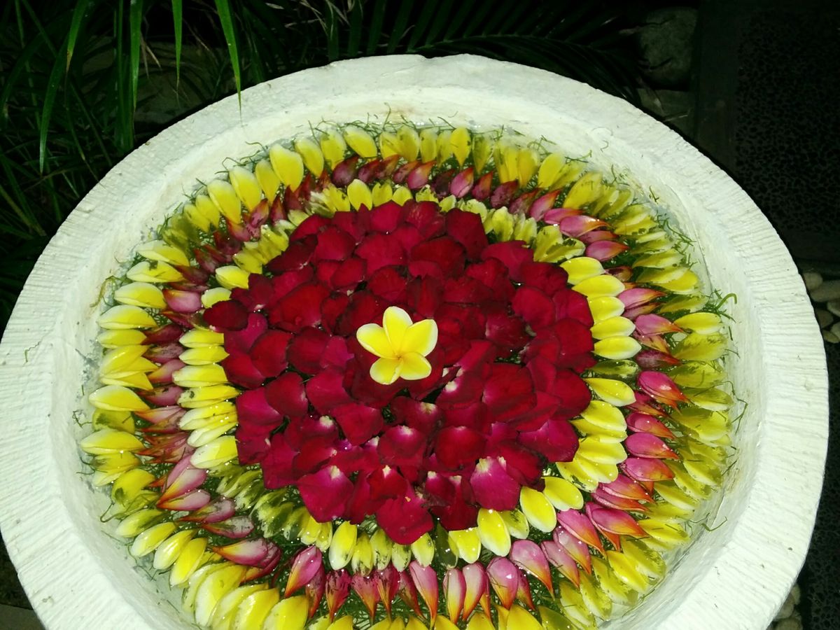 紙パンツとサロンに着替えた後フットマッサージから始まり、フェイシャルマッサージ、全身のバリニーズマッサージをして、ルルール後、30分間のフラワーバス。バスタイム中にはジンジャーティーとバリの伝統的な餅菓子がふるまわれ、おいしかったです。シャワーを浴びて、そのあと部屋を移動してクリームバス。洗髪とドライヤーまでしてくれます。全てココナッツオイルで行われ、部屋のアロマオイルもココナッツオイルが焚かれていました。更衣後はお食事。ナシゴレンかミーゴレンを選べます。ジュースもココナッツジュースでした。