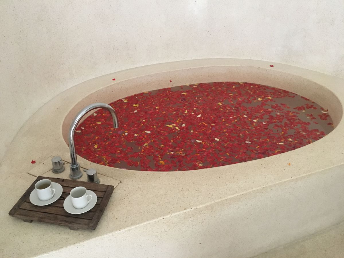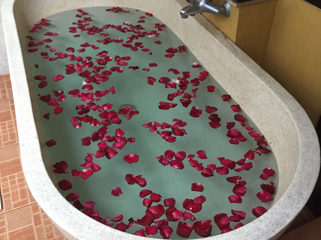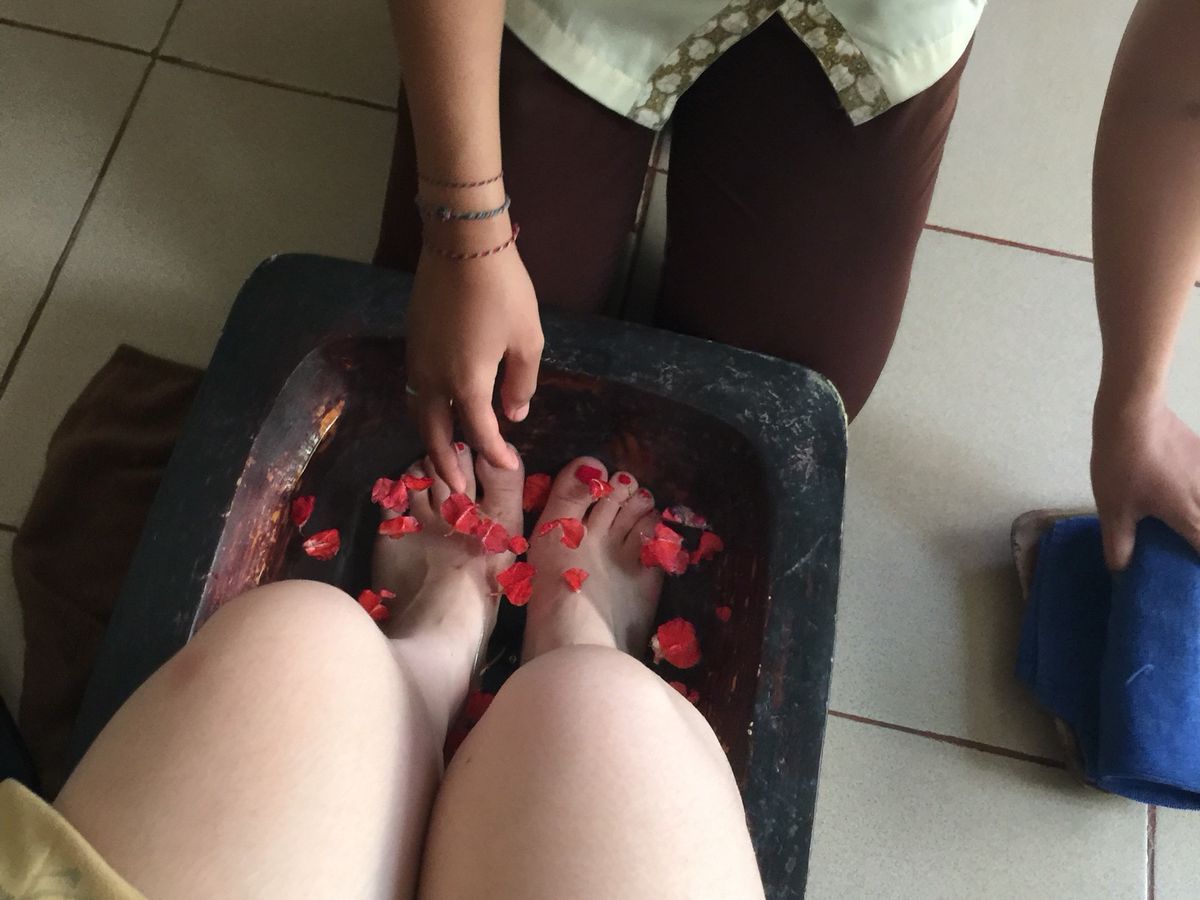 フットマッサージ→ボディマッサージ→フェイシャルマッサージ→フラワーバス(ジンジャーティーとクッキーが出ます)→シャワー→クリームバス