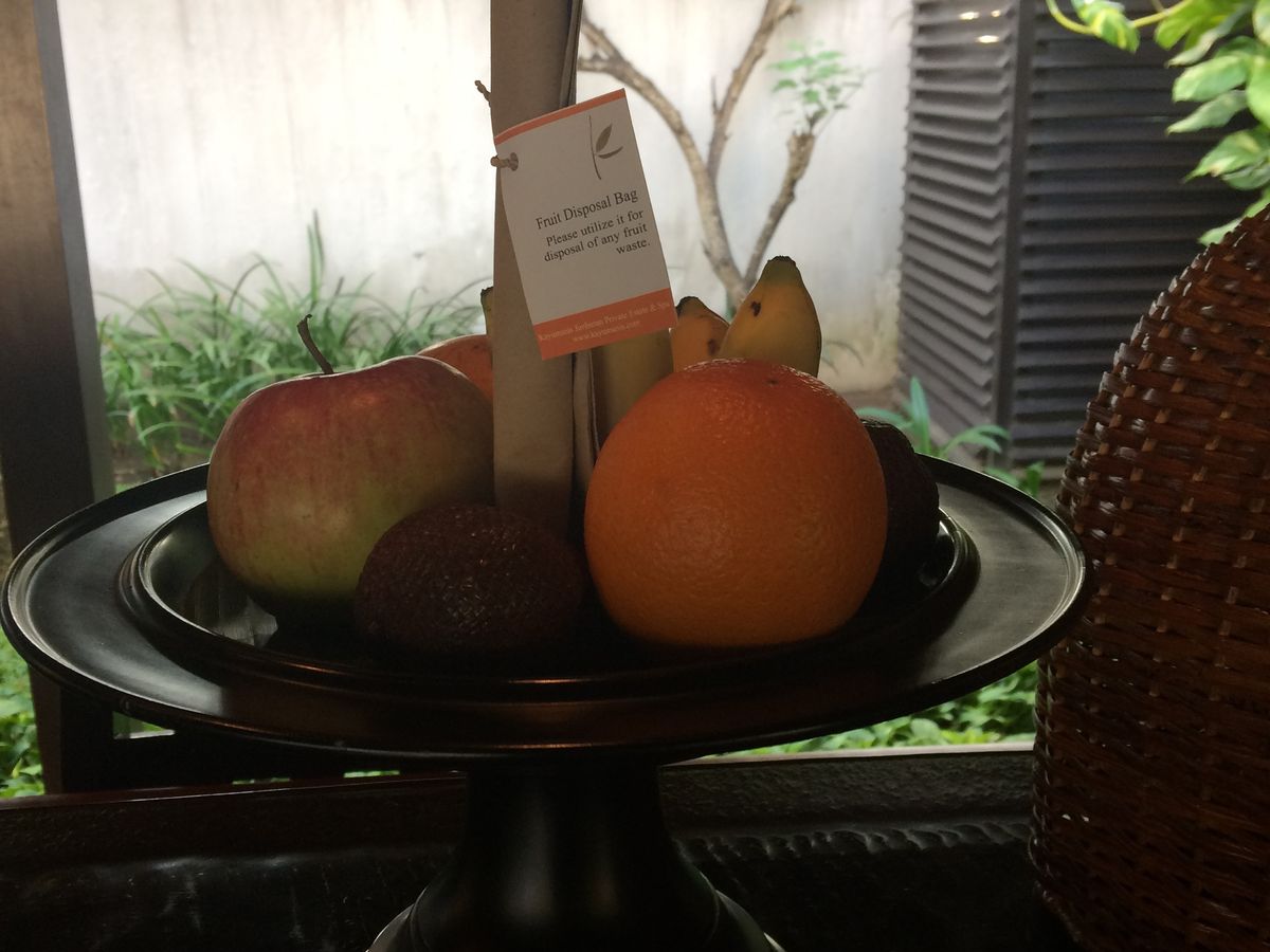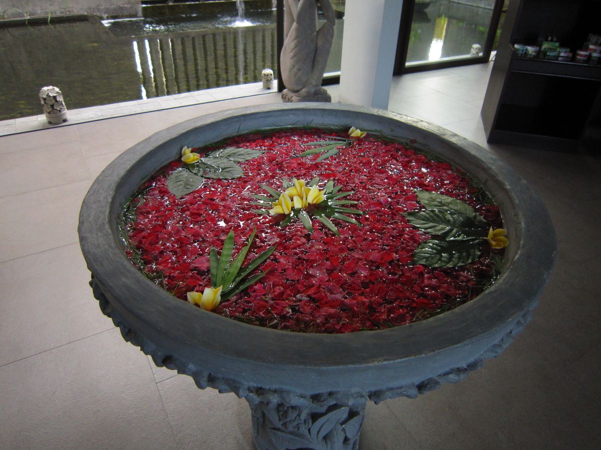 夫婦でザ・メデュケーションという6時間くらいのパッケージを体験しました。多くがマッサージかと思いきや、リラクゼーション中心のプログラムで、フットバスの後、マッサージ(指とストーン)で90分、ジャムーというインドネシアに伝わるハーブのボディスクラブ(私はパパイヤを選択)で30分、これをシャワーで洗い流して、フラワーバスに浸かります。これは花びらでそれぞれの名前を書いてくれていて、感動的でした。その後、移動してジュースを飲みます。それが終わると、フェイシャルマッサージ60分。これは気持ちよかったです。次はシロダーラというインドの眉間にオイルを垂らす施術かフットマッサージを選ぶことになります。私はフット。妻はシロダーラ。フットは日本でいうリフレですね。シロダーラは眉間がくすぐったくなったそうですが、頭の芯がスッキリしたそうです。その後、軽く肩のマッサージがあった後、クリームバスという、これも頭皮や髪に良いクリームパックで(私はアボカドを選択)日本の美容室のトリートメントの大層なものと考えてください。最後に蒸気を吹きかけます。シャンプー、トリートメントをして、髪を仕上げて終わりです。そして、着替え終わって、全部が終了したところで、ナシゴレンやミーゴレンなどの軽食になります。設備は日本にいる時と違和感はなく、