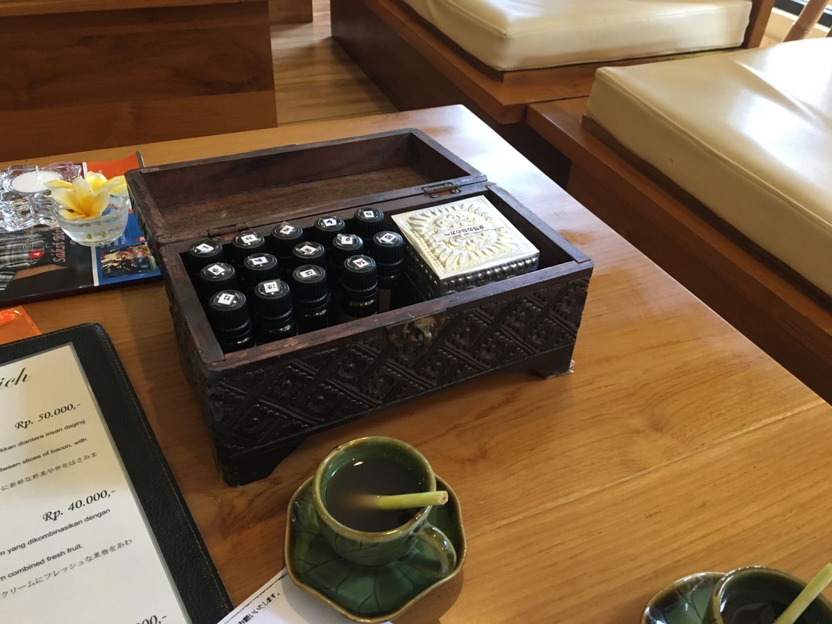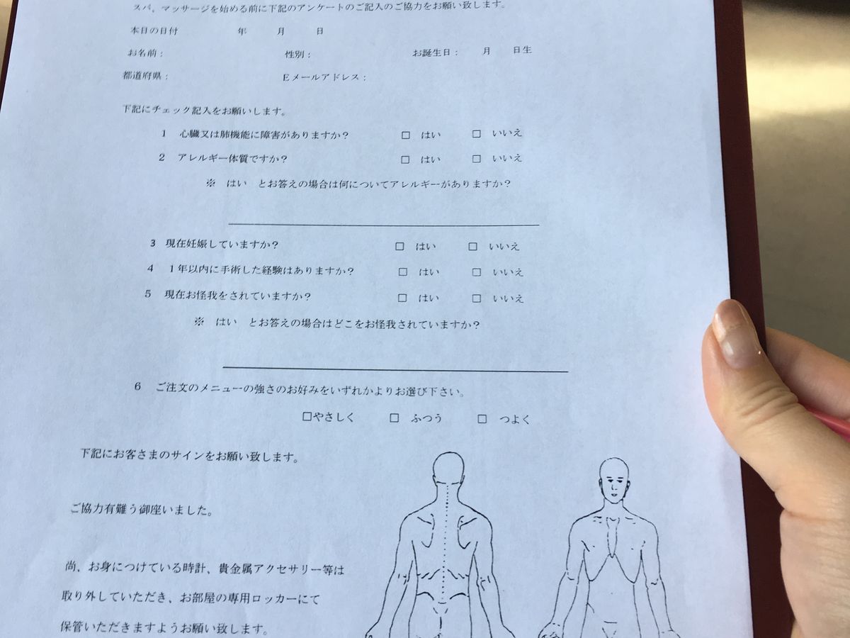 受付で5種類の中から好きなオイルを選び、アンケート(アレルギーなど)を日本語で記入。