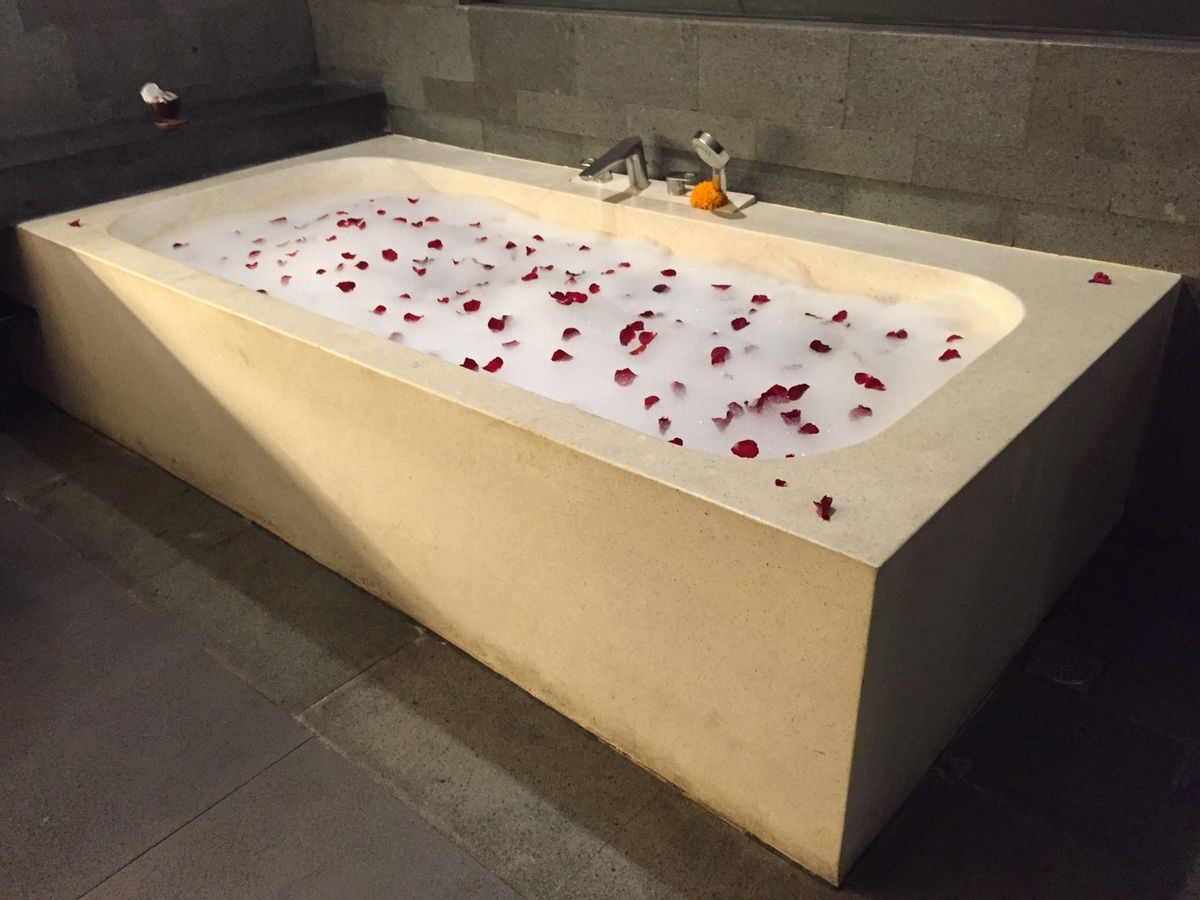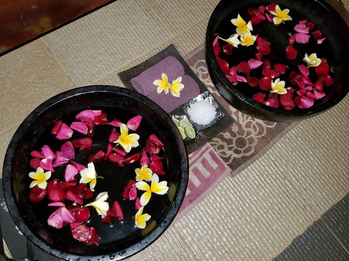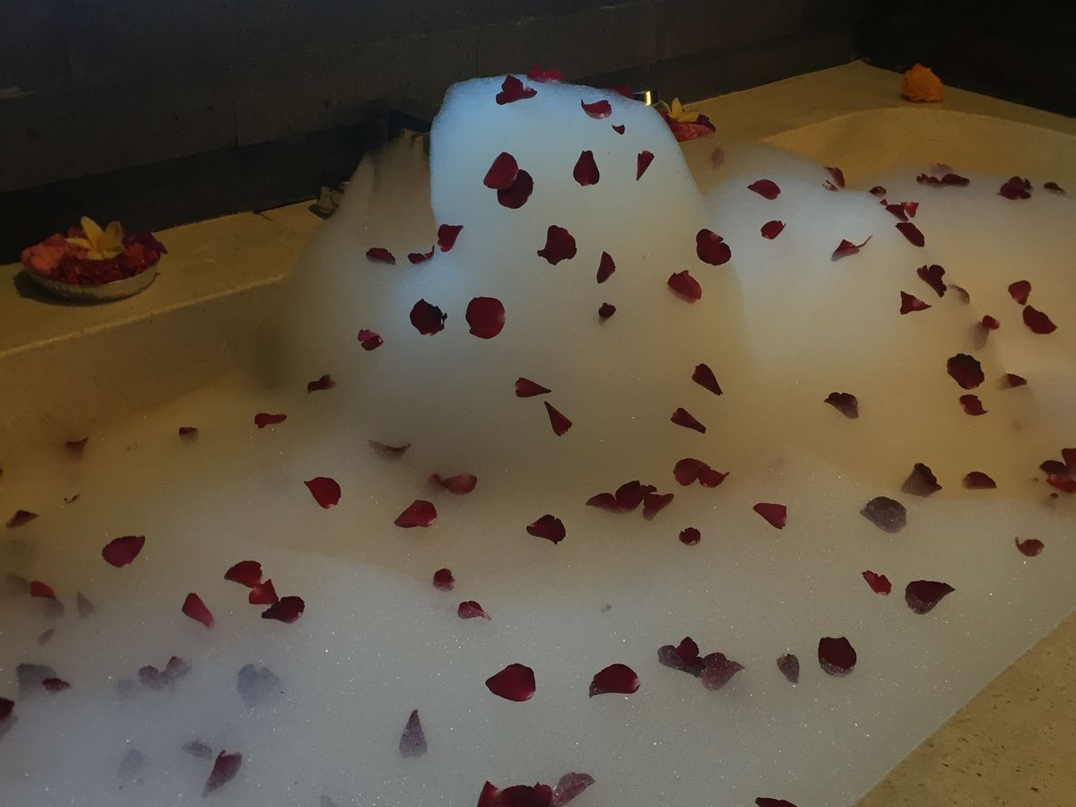 通常は2人で1つのバスタブ、つまり1種類のバスのみ選べるようですが、1人だけ花びらではなく一輪の花を使ってほしかったため追加料金をお支払いしそれぞれフラワーバスの種類を選ばせて頂きました。Bunga Pacahは一輪のため虫が混入している可能性があるとのことでしたが、せっかくなので選びました。ところが実際にみたら花びらでした。事前に色々メールでやりとりをしてくださっていたため、事前に情報をくださったり、もし認識が違うなら訂正してくださるとありがたかったです。