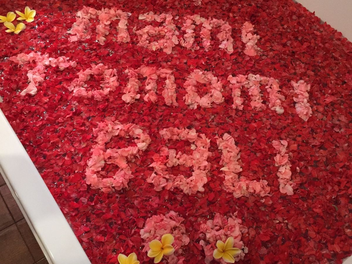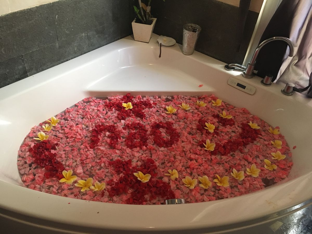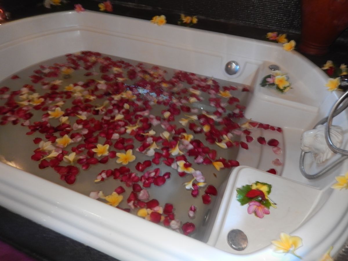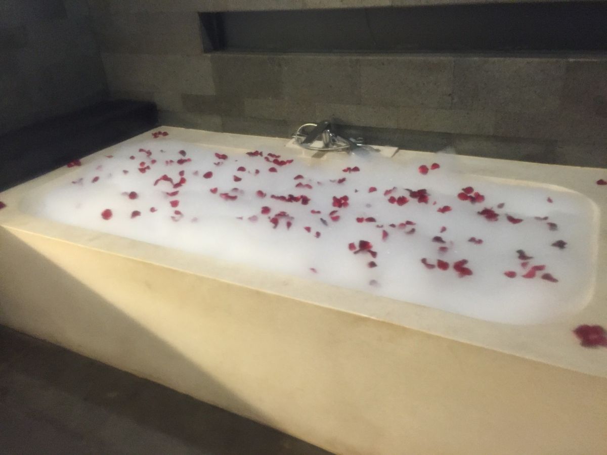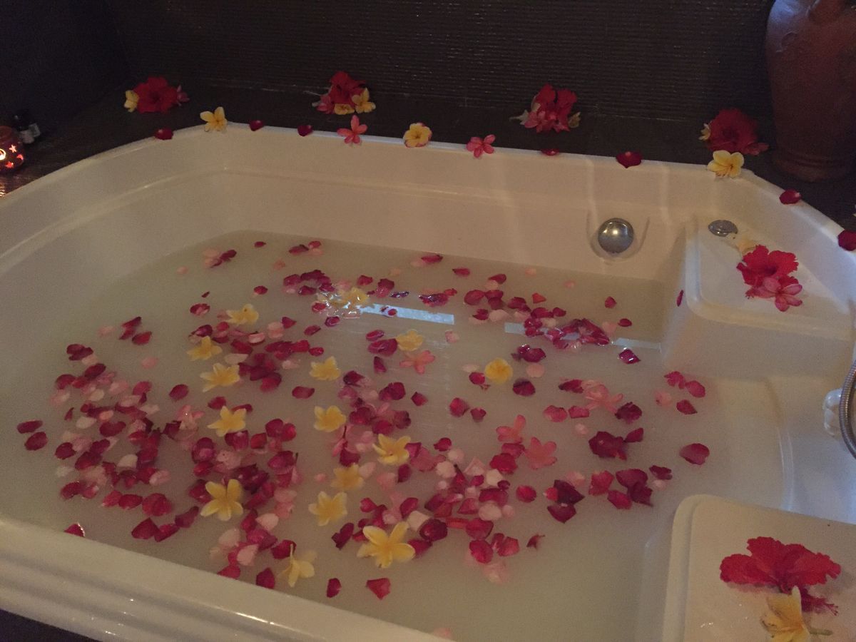 ボディーローションを塗り、20分放置。ローションは草の匂いでナチュラルな感じでした。ひんやりして、火照った身体にとっても馴染みがよい気がしました。お隣のお部屋に移動して、はちみつを身体に塗り、シャワーを浴びました。そして、フラワーバス!お友達と2人で入る感じでした。上半身裸に紙パンツを履いていて変な感じで笑っていました。フラワーバスにつかりながら、スタッフさんが用意してくれた、スイカジュースとクッキーで乾杯。15分間のフラワーバスを楽しみました。これはカップルにオススメかも!2人の距離がグッと縮まりますよ!そして、部屋に戻ると新しいガウンが用意され着替えて今度はヘッドスパ。上からオイルが落ちてくるマシーン?みたいなものがくすぐったくて気持ちよかったです!マッサージ師さんの手加減が私にはとっても居心地がよく、気がついたら夢の中でした。私のお友達も寝ていた様子でした。最後に部屋移動をし、シャンプーとリンスとまたヘッドマッサージ!鏡で見ると自分の顔がすっきりしていてとても気持ちがよかったです。ブローとドライヤーまでしてもらい、髪の毛本来のツヤを取り戻しました!とっても充実した3時間で終わるのもあっという間でした。またバリ島に訪れた時にはこちらのサロンを使わせて頂きたいと思っています!何しろ、他のお客さんとすれ違うこともなく、貸切気分でリッチな雰囲気でした。充実したプランで参加してとってもよかったです!参加する際はすっぴんで行ったほうがいいです!ぜひ皆さんも参加することをオススメします!ホテル間の送迎のお兄さんもとっても優しい感じでよかったです。