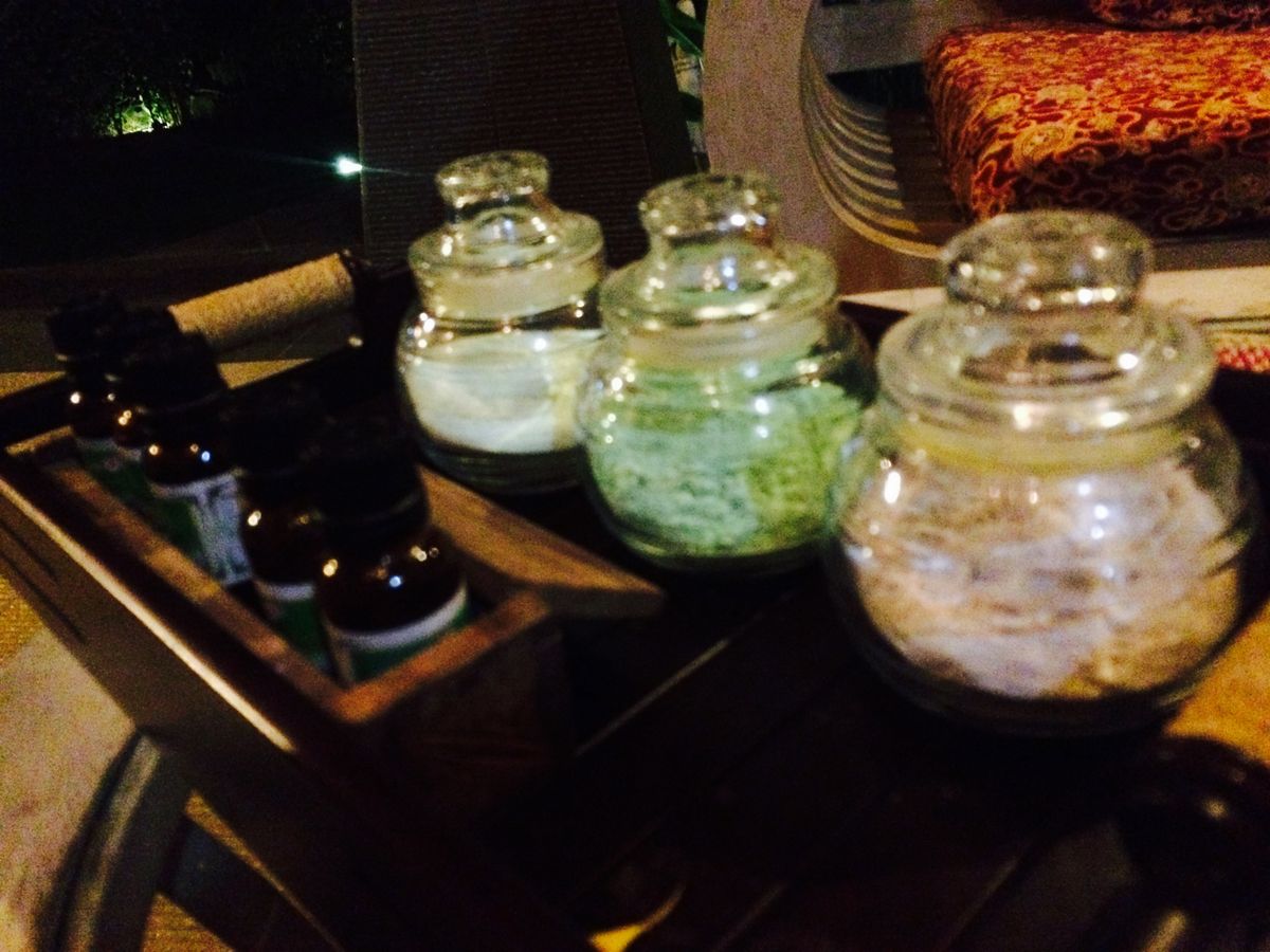 ボディスクラブを塗られたあとしばらく放置され、その間にセラピストさんたちはフラワーバスや次のボディマスクを作っていたようですが、寒くて寒くて、体に付いているスクラブをこねて丸めて遊びながら気を紛らわしていました。