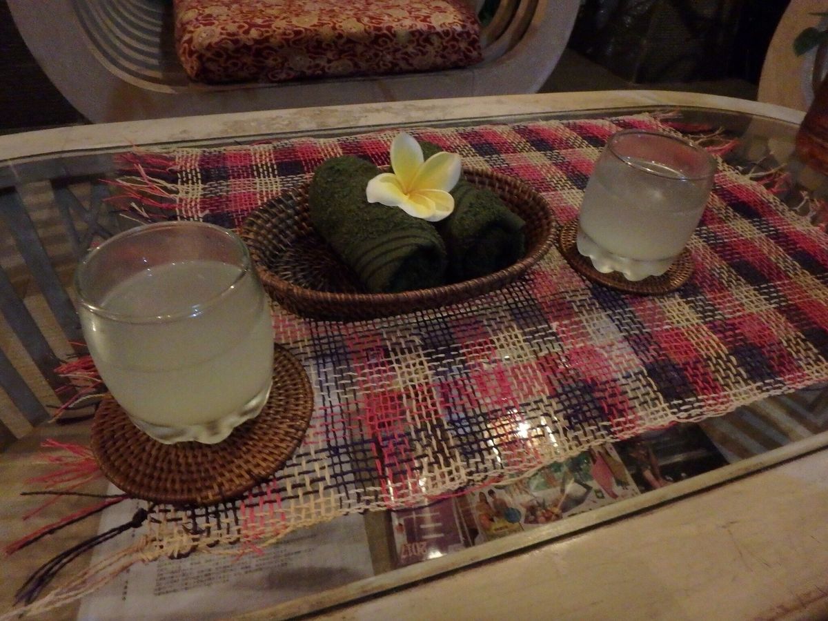 今回は3時間のマッサージスパを体験させて頂きました。まずはじめにジンジャーティーのウェルカムドリンクを頂きました。甘いけど、スパイシーな感じでとっても美味しかったです。暑いバリ島にぴったりのドリンクでした。お部屋に移動し、まずはじめにうつ伏せになり背中と上半身からマッサージがスタート。そしてそれから、足に移動。今度は仰向けになり、足、上半身、腕と移動。スタッフさんが可愛いカタコトの日本語で、いつも『痛くない?』と気にかけてくださり、とっても雰囲気の良い感じでした。最初は意識がはっきりしていたのですが、途中から夢の中へ、、。笑