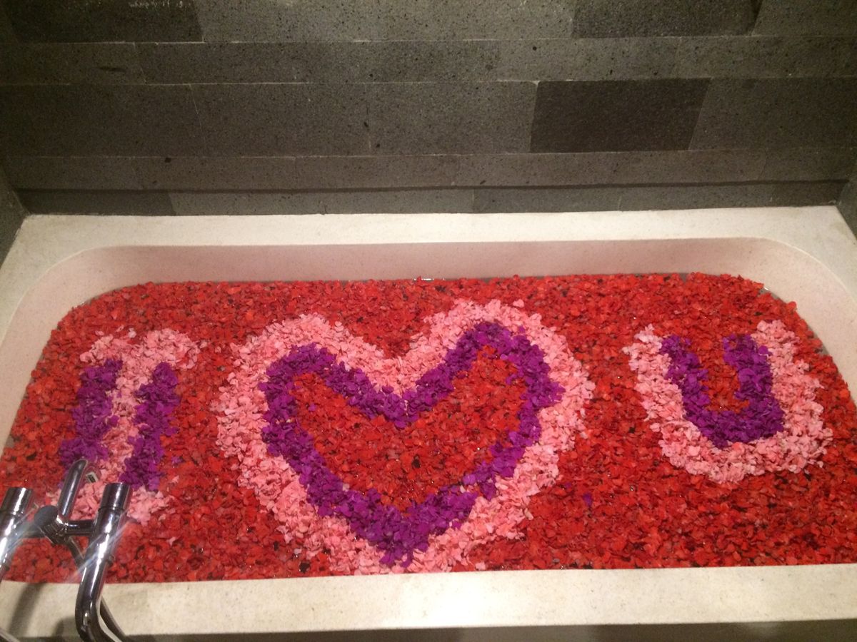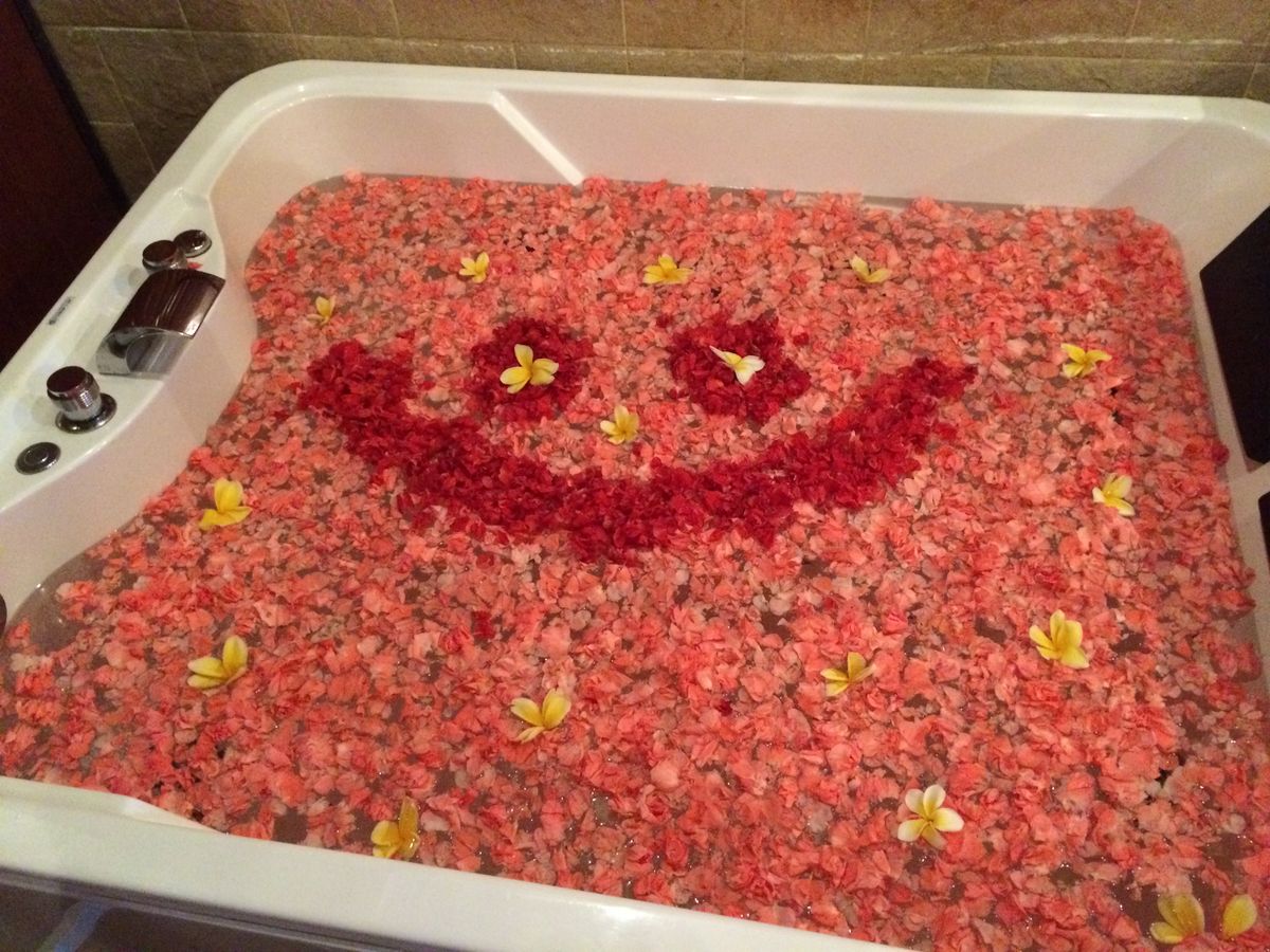 50代夫婦には花びらで名前の書いてあるフラワーバスは気恥ずかしい感じでしたが、ちょっと若返った気持ちで二人で入りました(日本では二人で入りませんので・・・)
