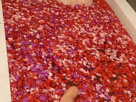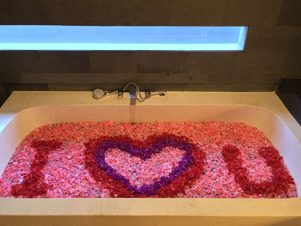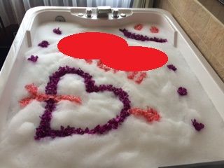 フラワーバス(15分)は浴槽いっぱいにお花が浮かべてあって、I LOVE(ハート) Uと描かれていて、超テンションUP!温度も適温でした。