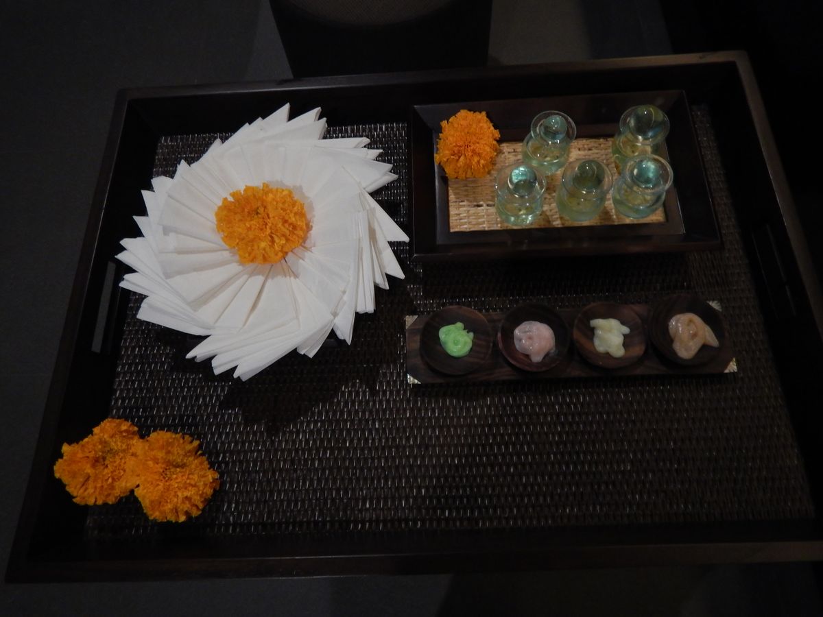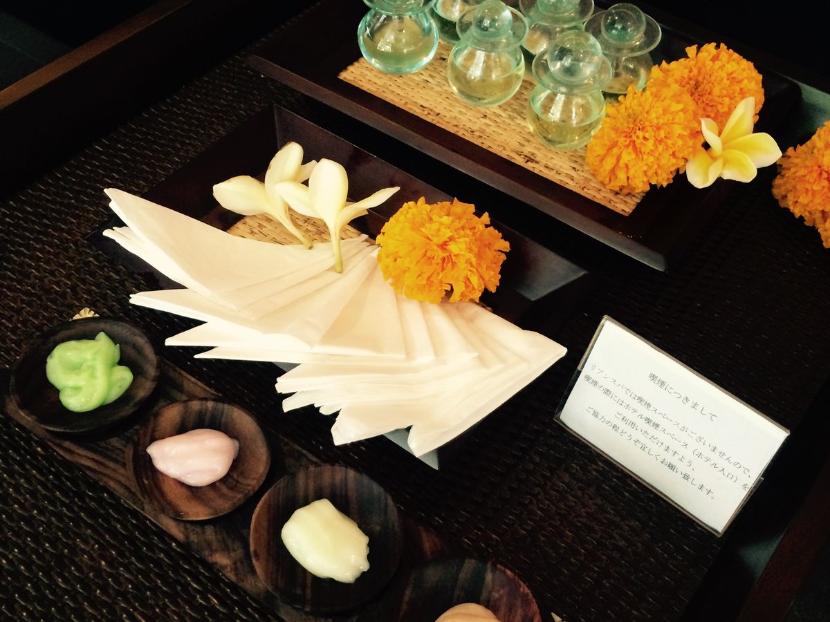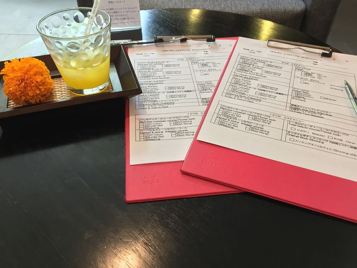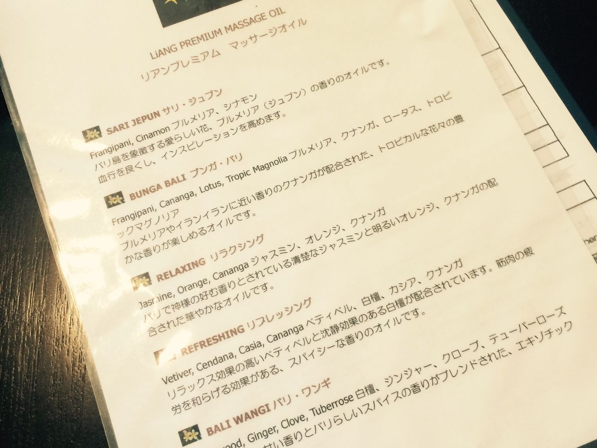 まず到着するとオレンジジュースのウェルカムドリンクがあり、施術中にもあと2回飲み物のサービスがありました。施術メニューの再確認後、カルテに記入してオイルの香りを選択しました。オイルマッサージをやってる間中、香っているので、このオイルの選択は慎重にしたほうが良いと思います!